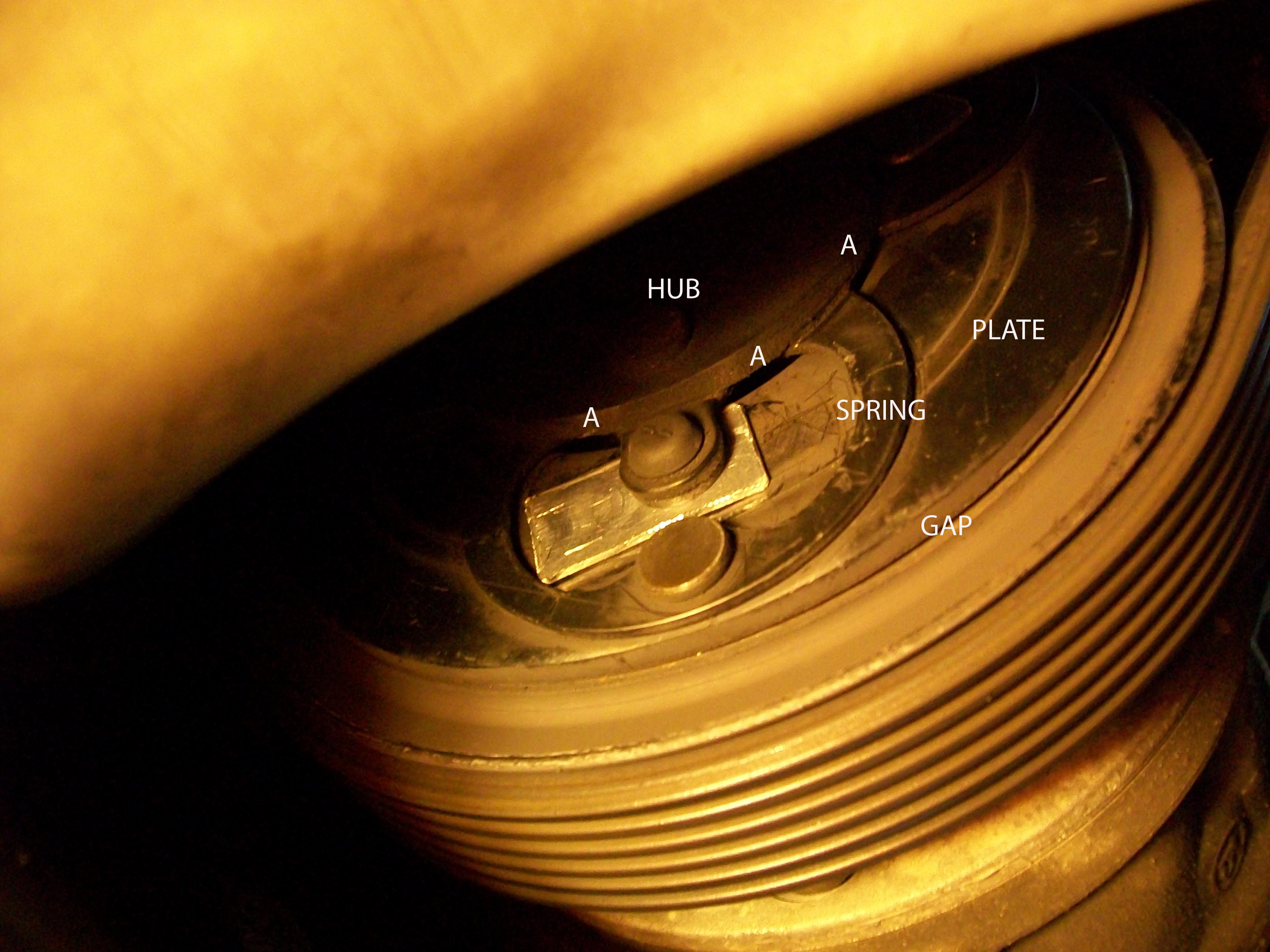 5. Use a screw driver or other similar implement to place in the space labeled “A” to pry the plate away from the rubber spacer and hub so that you can slide the shim in. You will need three shims. After placing a shim you can just twirl the plate around with your hand to the next spring/spacer. Placing the third shim may be more difficult than the first two because you have removed a lot of the play in the clutch but it is quite doable.