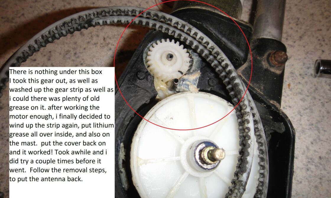 One of a dozen or so photos of the antenna fix procedure. Follow the link below to see the entire DIY. Extend the antenna mast all the way and then wind the gear with the strip on it by hand.