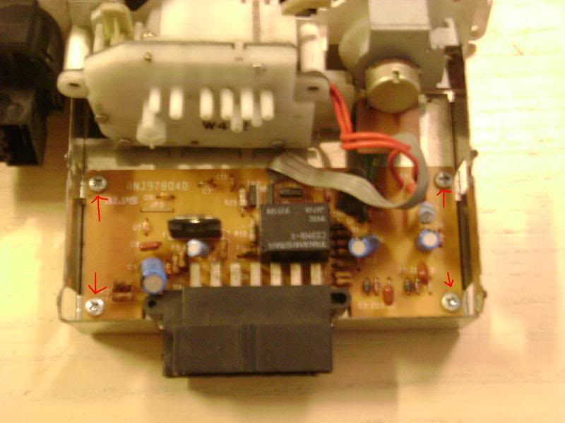 Once you have it out of the car and the black cover off you will see this. Remove the 4 screws the arrows point to.