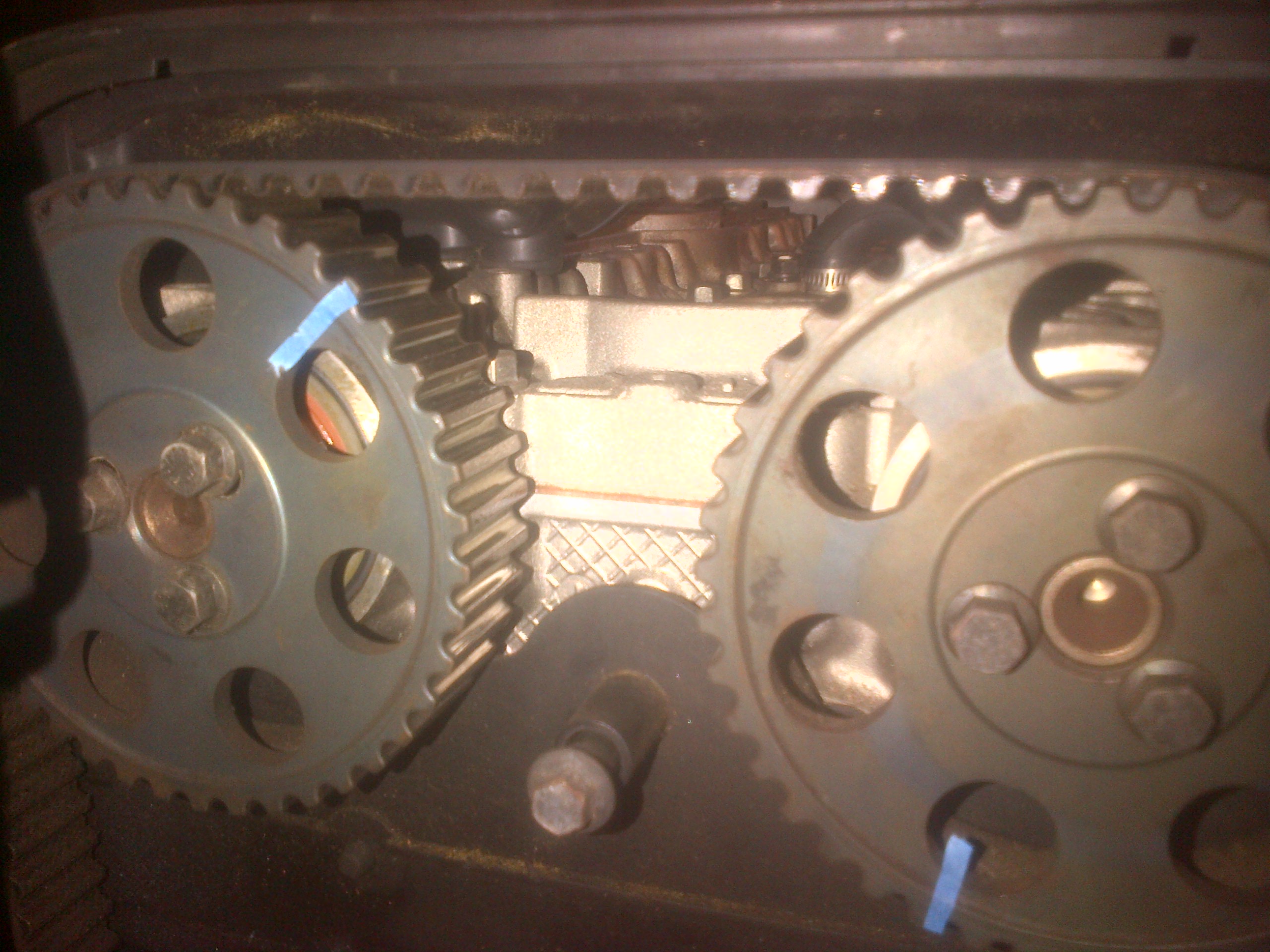Here is a picture of the cams. I placed small strips of blue masking tape on the hash marks for you to see a bit easier. It certainly seems as though the timing is off.....and not just a few teeth. I was thinking of changing the belt/tensioner and then rechecking the compression. My questions: is th...