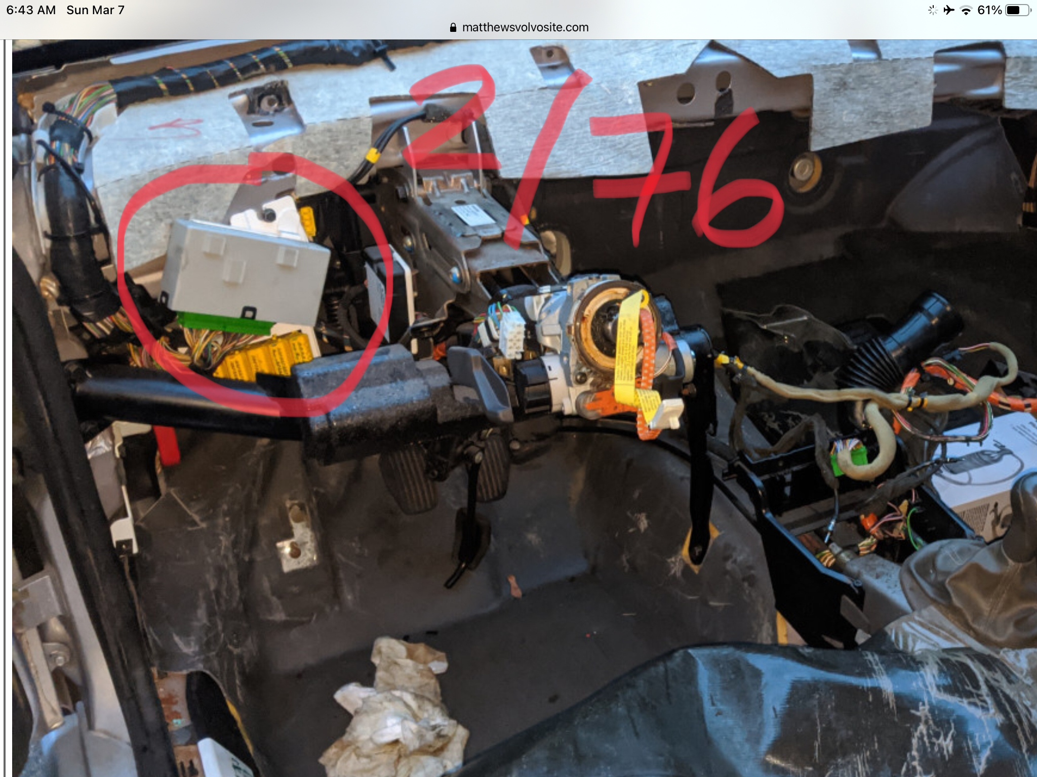 Here’s a nice picture from Sean’s rebuild showing where the 2/76 immobilizer controller sits. The white clips slide into the metal frame attached to the crash bar. You can get it out after removing the driver kick panel