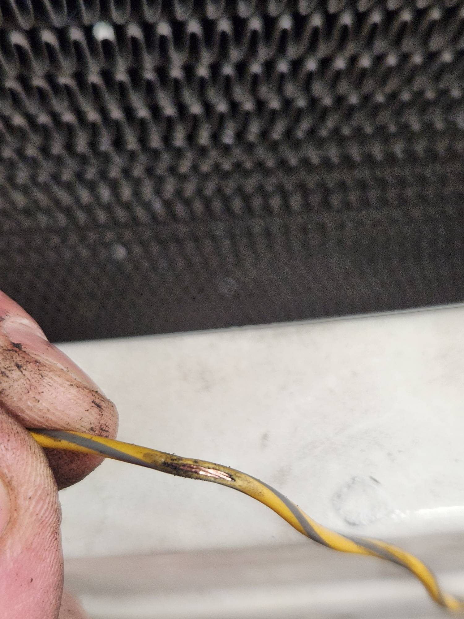 All I can figure is the 10 gauge ground wire for the cooling fan, which wire runs through the loom, overheated in a 4" section damaging its insulation, exposing copper, and that then caused damage to adjacent wires, allowing some of them to short to ground. The section in the loom where this occured is close to the back end of the A/C compressor. I found 6 wires with exposed copper, several more with insulation worn almost all the way through. One of the IAC wires was one with exposed copper. I removed the ground wire entirely from the loom and ran a replacement 8 gauge wire independently, outside of the loom. The rest of the wires cleaned up well, copper strands seemed intact and insulation seemed relatively decent beyond the small openings shown in pics, so I individually taped up each of the spots and reassembled the loom. Haven't gotten beyond that point because I'm taking the time to address some other maintenance issues (lower radiator hose and tackling the engine-side heater hoses since I'm already this far into things). So folks will have to wait for a verdict on whether this solves my problem, but given the exposed copper it seems pretty clear that this was the cause.