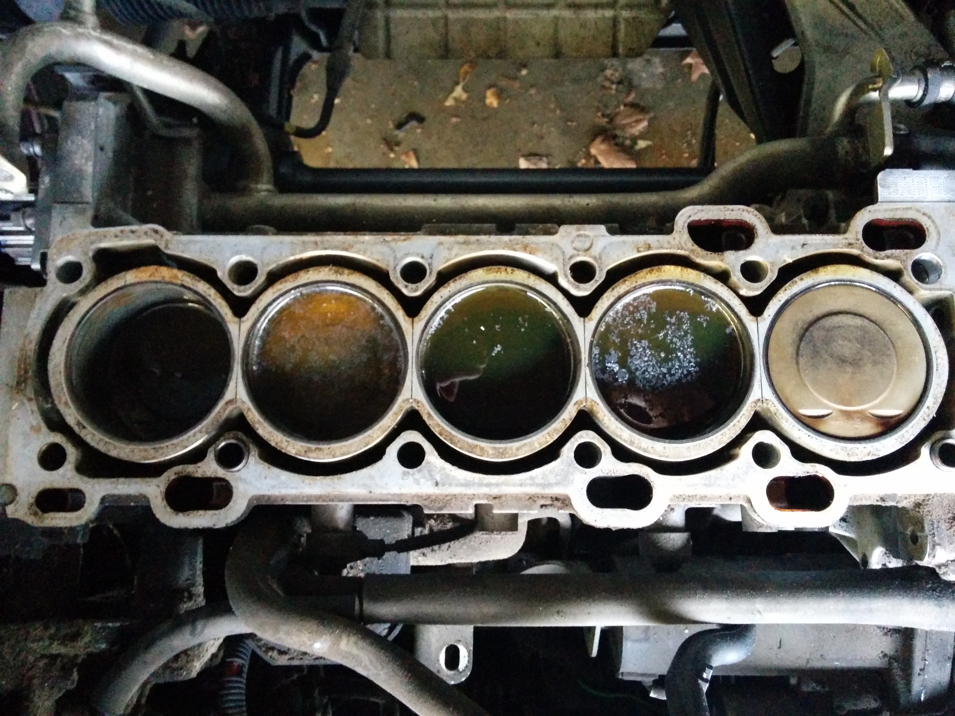 It looks like the surface between cylinders 2&3 and 3&4 have a little cleaner area, but could just be my view. And in the pics the top of piston #5 looks pretty clean. How do the others look with just sopping the water out, not scrubbing?Did the shop verify the timing was still correct, or just that the belt hadn't jumped or broken?