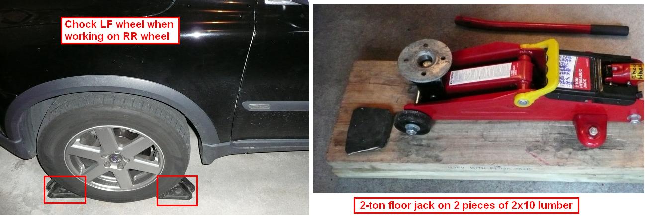 - Safety is #1 concern, so when working on RR wheel, chock the LF wheel on both the fore and aft parts as shown. I am a minimalist, my garage is tight, although I can afford a 3-ton floor jack, I don’t want it simply b/c I don’t have space and also it is heavy at 70 lbs+. I have a trust-worthy 2-ton floor jack ($20 at Harbor Freight or Advance Auto)…I simply add 2 pieces of 2x10 lumber (SUV has high ground clearance, so the lumber pieces raise the floor jack up), some plumbing adaptor, piece of tire rubber as cushion and I am good to go.