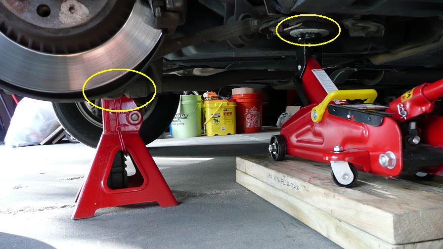 - Place jackstand below the control arm as shown. Then I SLOWLY lower the jack a bit, as if to share the load so roughly 50% of jackstand and 50% on floor jack. Another way is to lower the floor jack and gently jack it up until it is snug against the jack point. Then give it 1-2 more pumps.