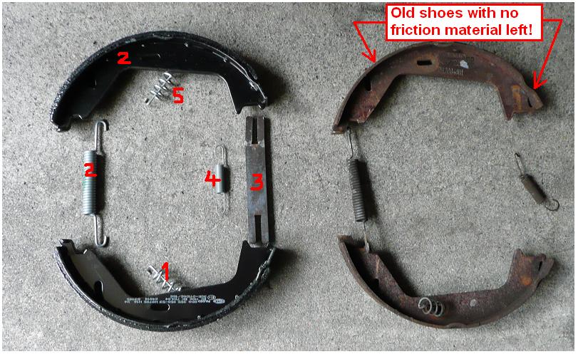 Impressive write-up. Installing the brake new brake shoes is very hard indeed. I found that placing the part '3' the last while having one of the shoes lowered from the drum worked the better.