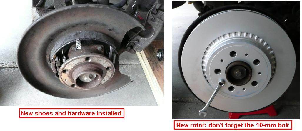 2. The 10-mm bolt holds the rotor in place. Once the 10-mm bolt is off, tap the rotor with a hammer to get it off. Release the Parking Brake first!!!
