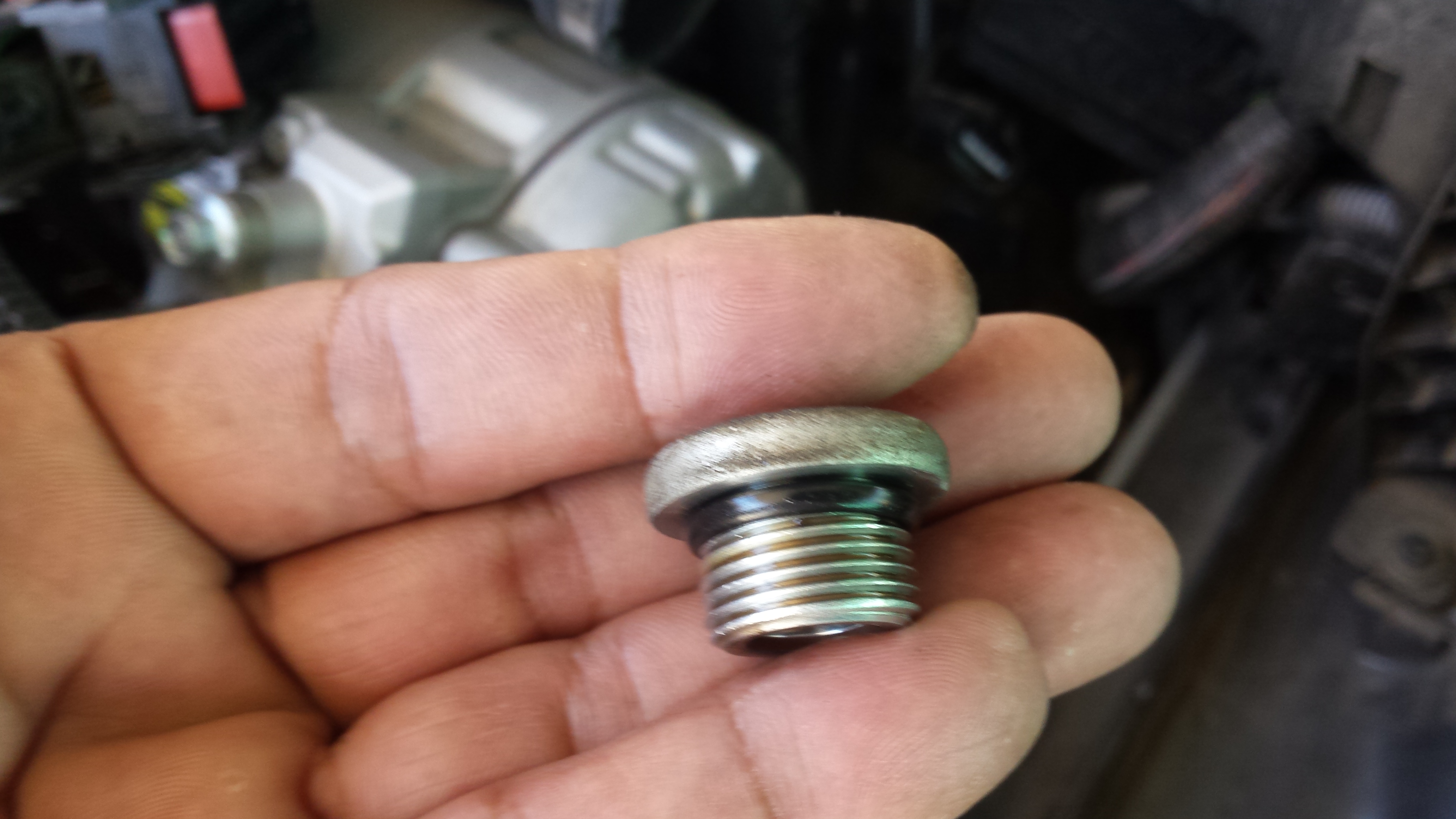 I am glad I did change my transmission oil! I had 70K and the oil was dark brown. I would like to post a picture of transmission oil integrated plug. The small T40 screw has O-ring (not visible now) and the 17mm hex has a crush seal aluminum gasket. My suggestion- change both of them.
