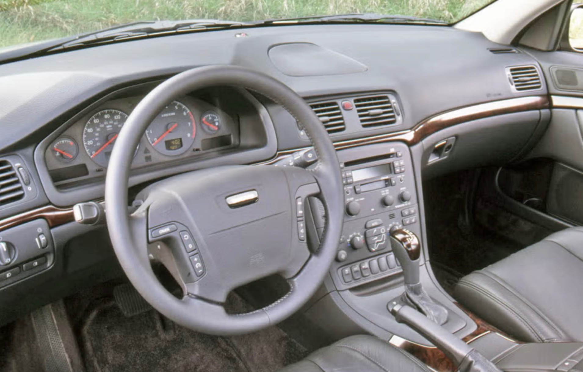 The one thing the future according to Volvo doesn't hold for us, apparently, is grins. Perhaps in keeping with the com­pany's safety image, the S80 comes across as a solemn, sober car. With the exception of what happens when you tip into the twin-turbo "T6" engine, as on this top-of-­the-line test car, there's not a lighthearted gesture to be found anywhere. Shades of charcoal cover the interior, interrupted only by a band of nicely finished wood­grain that circles most of the way around the passenger compartment. Except for the headliner, everything else is charcoal. Even the instruments are charcoal dials on a charcoal background, for heaven's sake. So relentless is the seriousness that a Mercedes E-class seems like 3500 pounds of giggles by comparison.