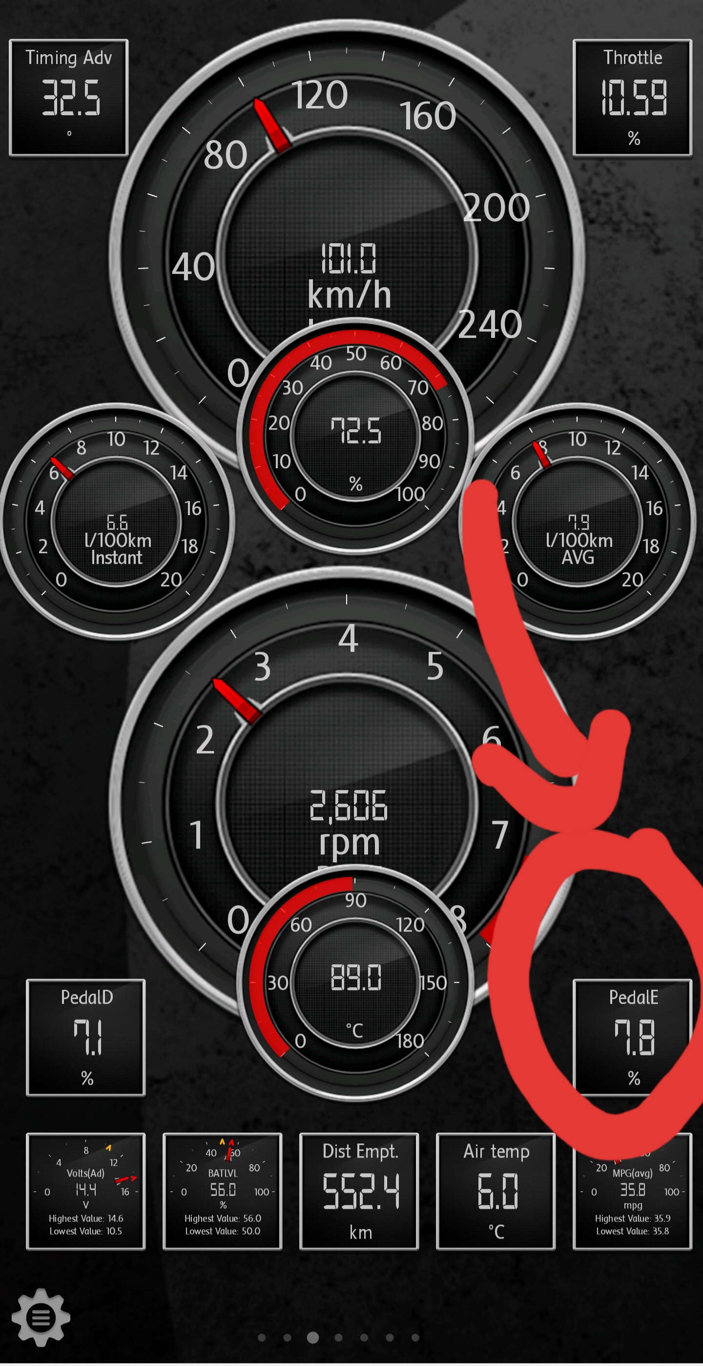 My PedalE on the torque app that used to fluctuate in the accelerator pedals resting position is absolutely stable at 7.8 when the accelerator is not being pressed(like when cruise control is on). What would happen before was it would be stable for a while and then start to fluctuate between 5.7 and 7.8 and then drop to 0 before the red triangle would come on.