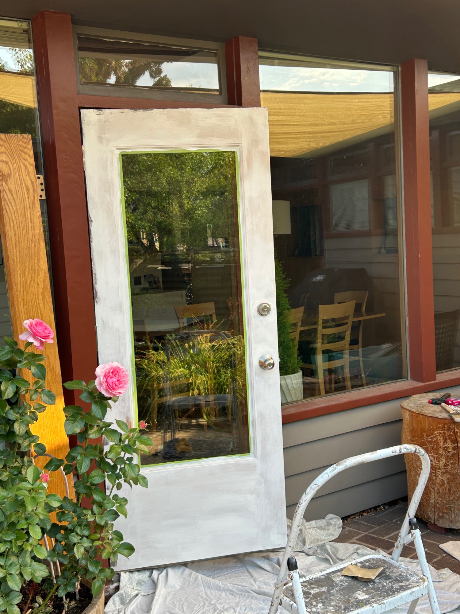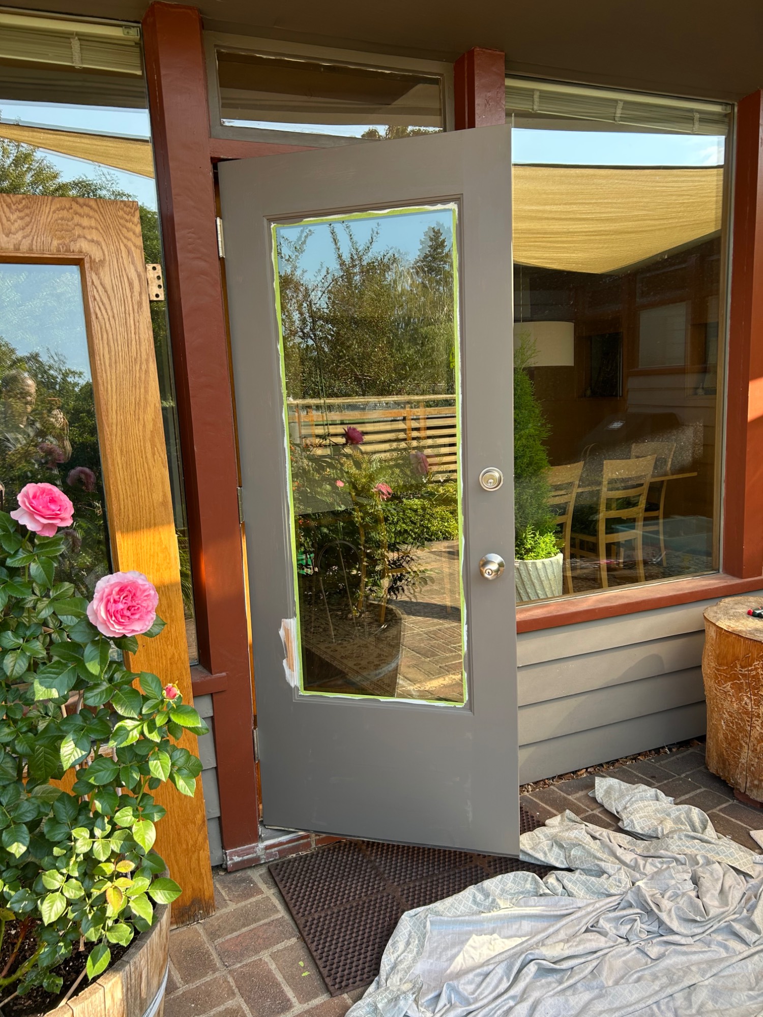 I never would have considered a fiberglass door, but it has no roof overhang and faces straight west, gets pounded by late sun and blowing rain. The old one had been replaced at least once (I cut it up and it was particle board) and had a huge curve from head to lock to sill. Sunlight showing top and bottom. So I thought I’d try this instead, and it’s well insulated.