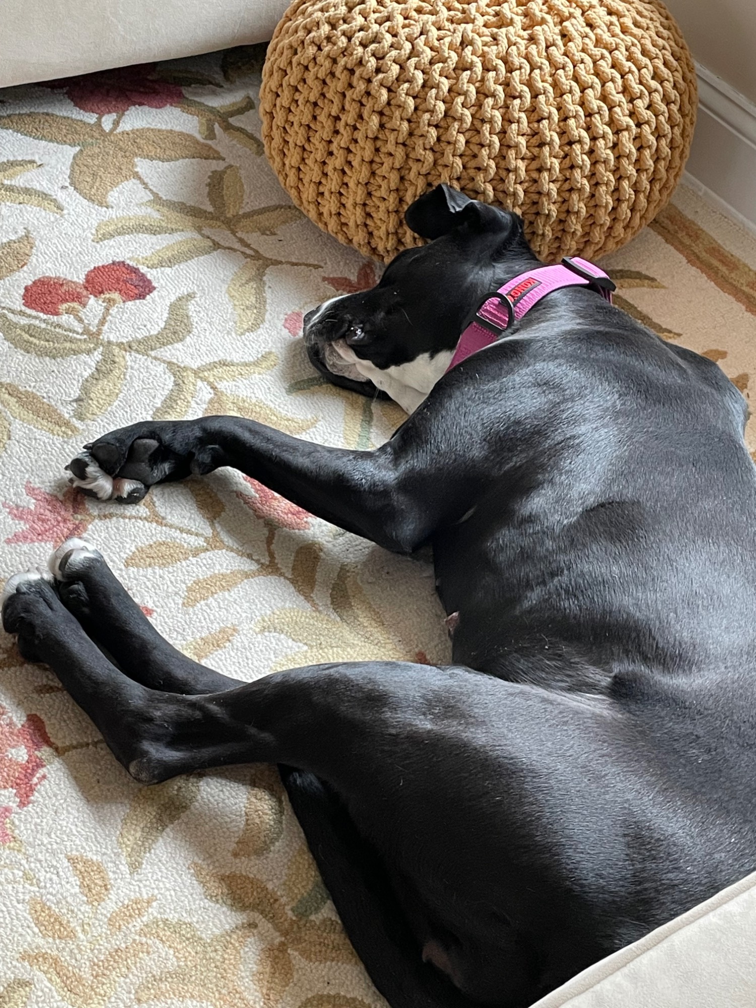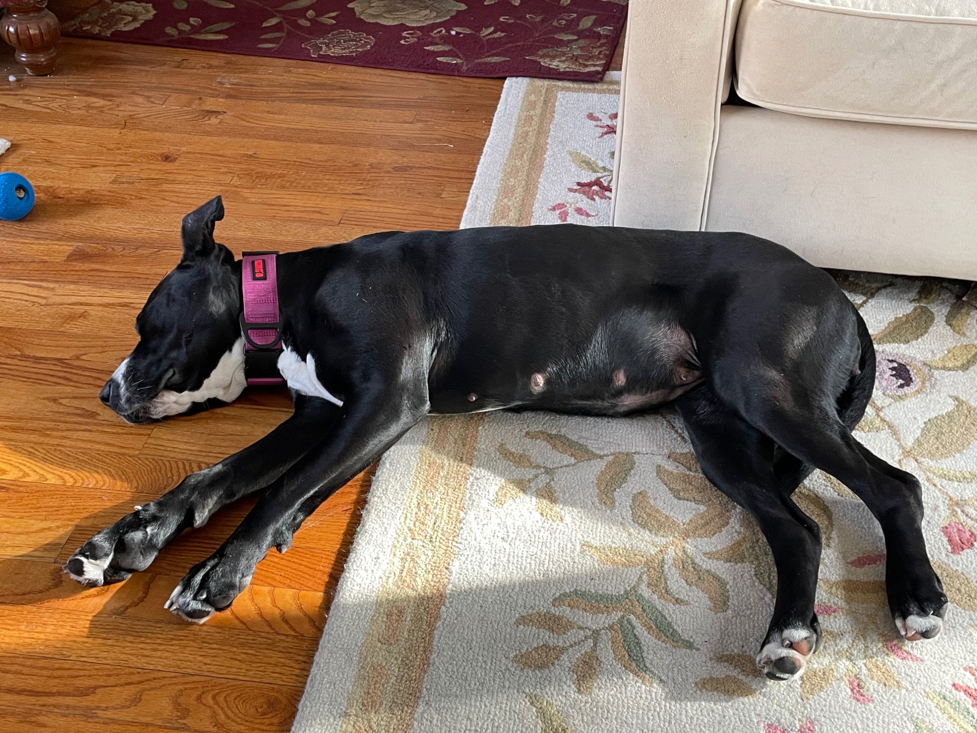 We adopted her from ARF inEast Hampton, an hour away. She is a real Sweetheart. Had four puppies when found in GA, was in NY for 6 months. We visited her on a Saturday , she walked with a loose leash, returned on Sunday to bring her home. They think she is about 4. Danesdont live thst long so we hope she has lots of lab , too.