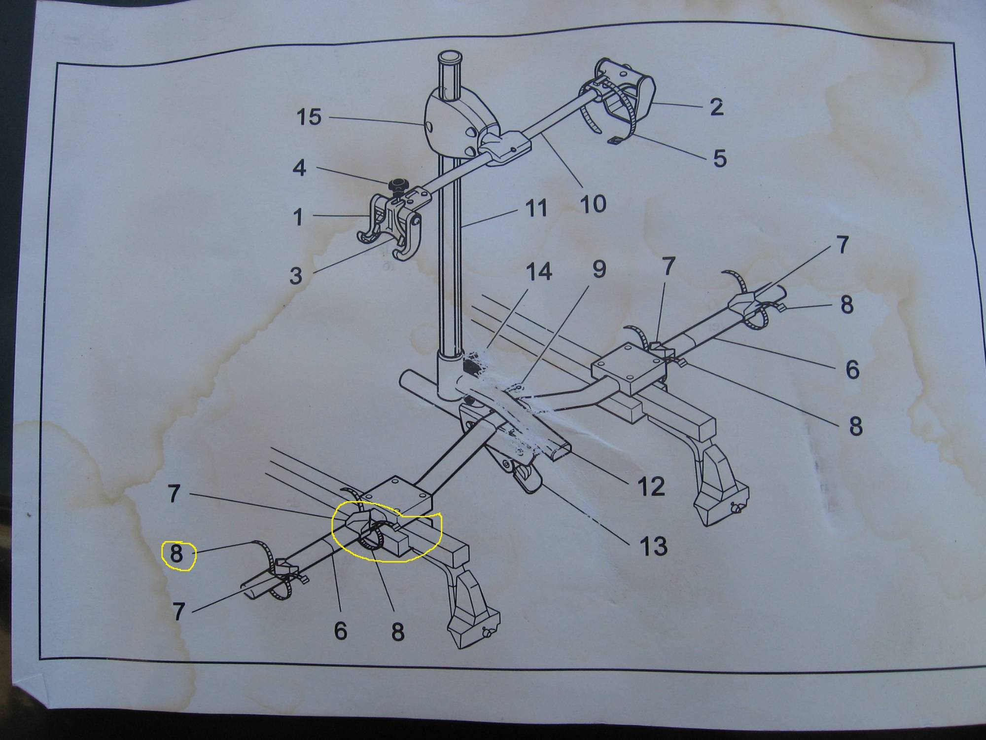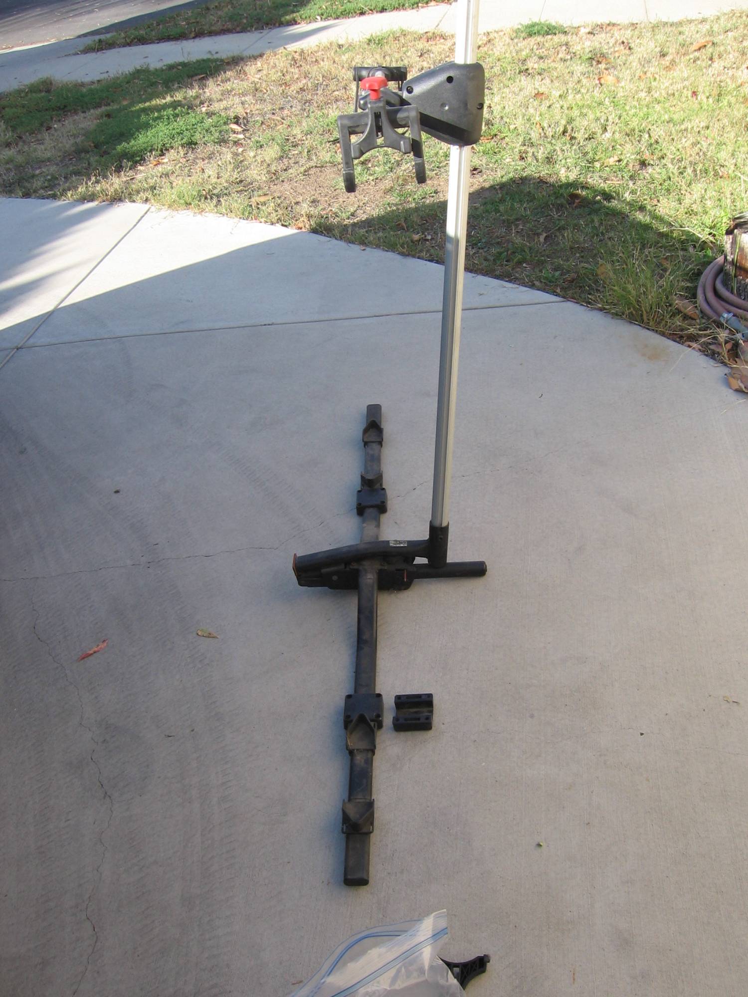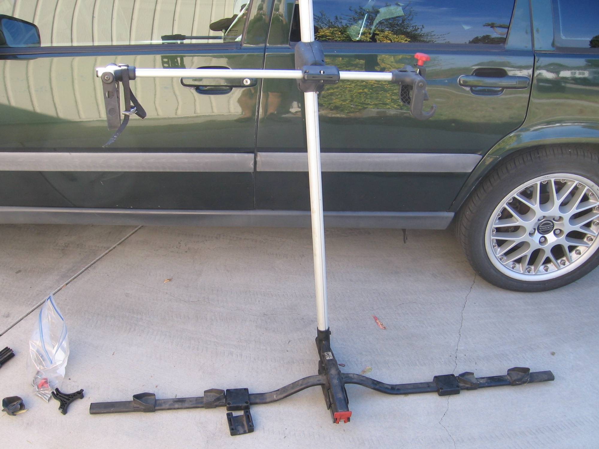 I have a Volvo bike rack with some missing parts and extra parts (two additional uprights that hold the bike). Missing one of the bottom clamps (circled). Might be easy to fabricate. Also missing all of the No. 8 straps, which could be replaced by some bike toe straps. Pick up in Los Angeles. If you want it shipped to you, I can do that but just pay for shipping.