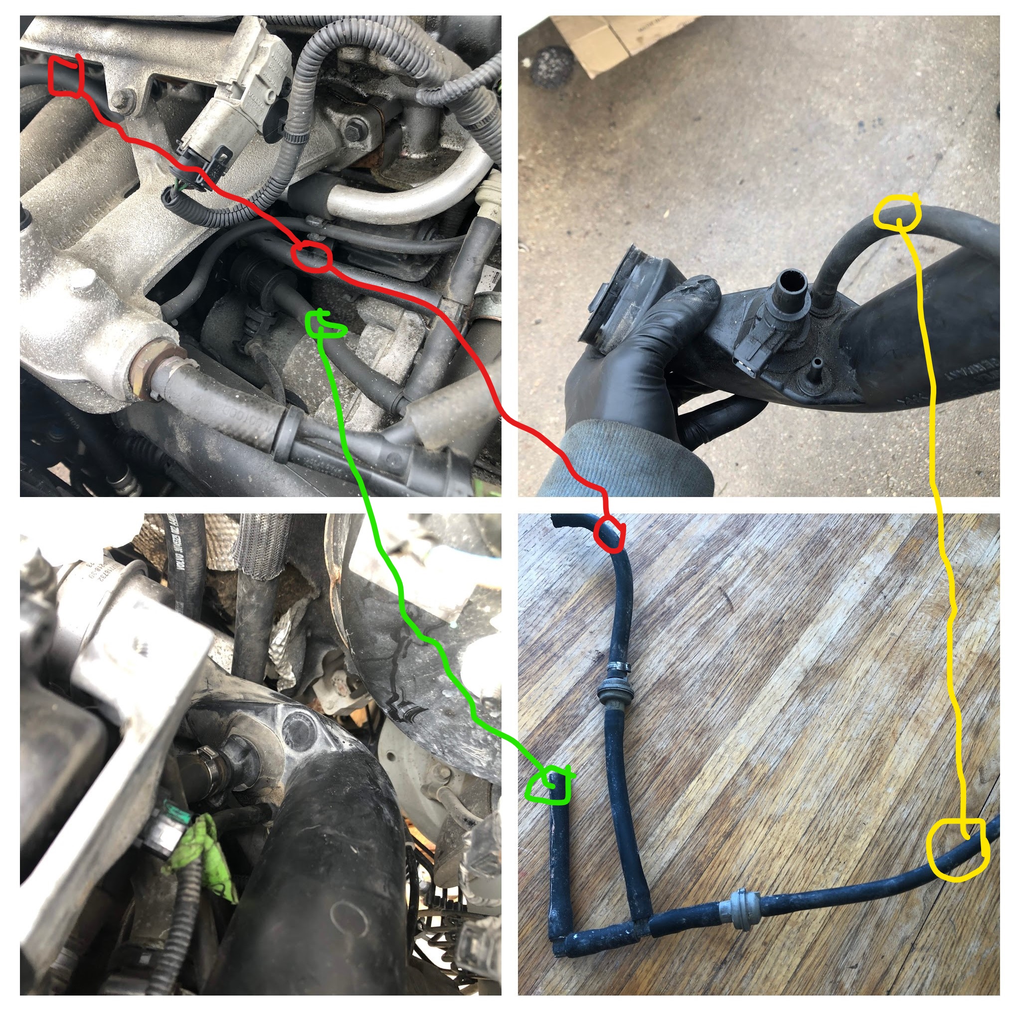 I struggled to reassemble vac hoses after engine swap. One reason for my confusion was that donor engine came from '06 XC70, but mine is a 2008 S60. I even made an extra trip to the junkyard to take pictures of vac hose routing, but it was all in vain, because it turns out Volvo modified routing for year 2008. Take a look at the attached photo collage (sorry, it's the best I could wrestle out of Google Photos). Bottom left photo is from my 2008 S60 air hose, the other three pics are from the 2006 vehicle. Bottom right is the hose I took from the junkyard before I realized it was not necessary. In the upper right pic the bottom hose bib is where turbo connects. My pencilwork on the image is not very good, but it is accurate.Hope this helps.