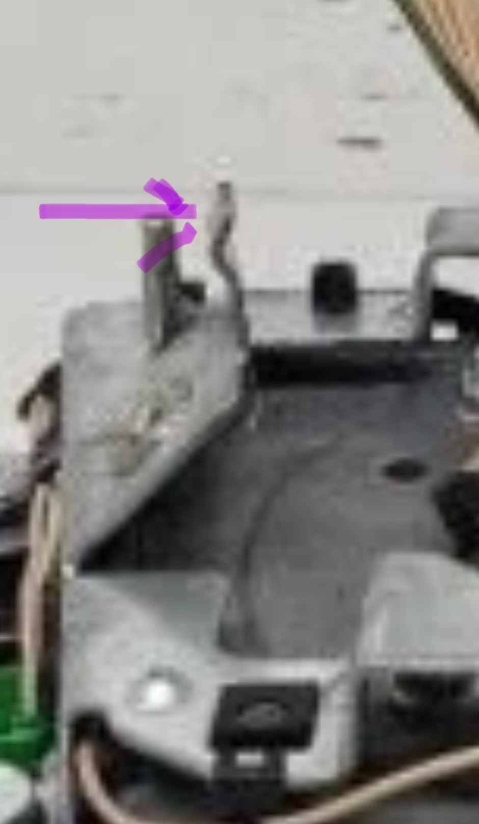 Picture 1. The airbag steel tab circled. Does that lever fit into the area on the tab where the purple arrow is pointing or does it go over the top of the tab and click in behind it.