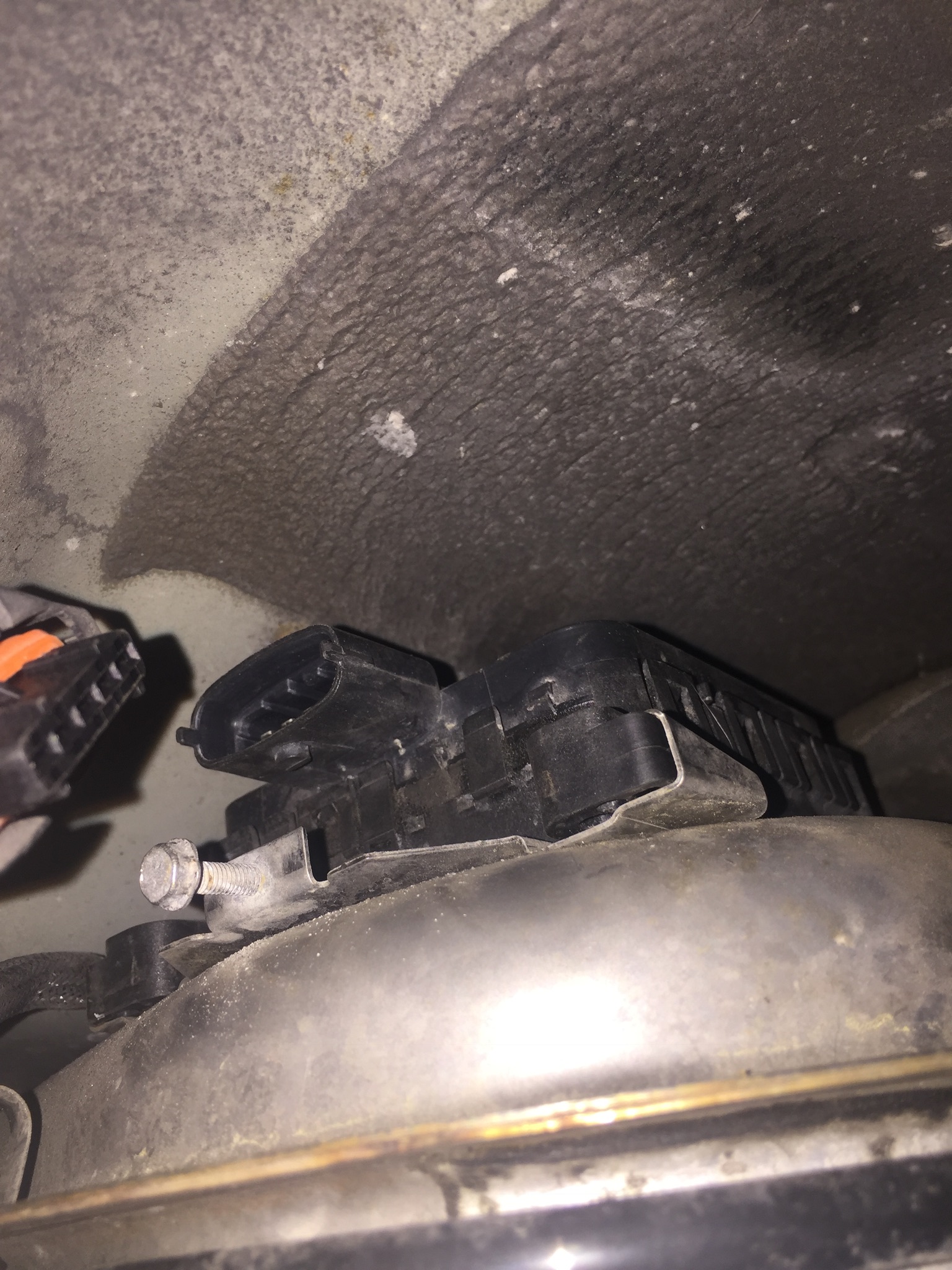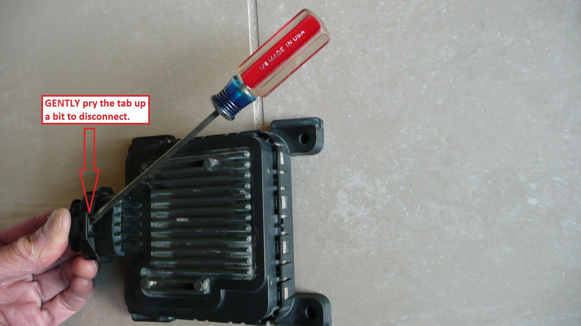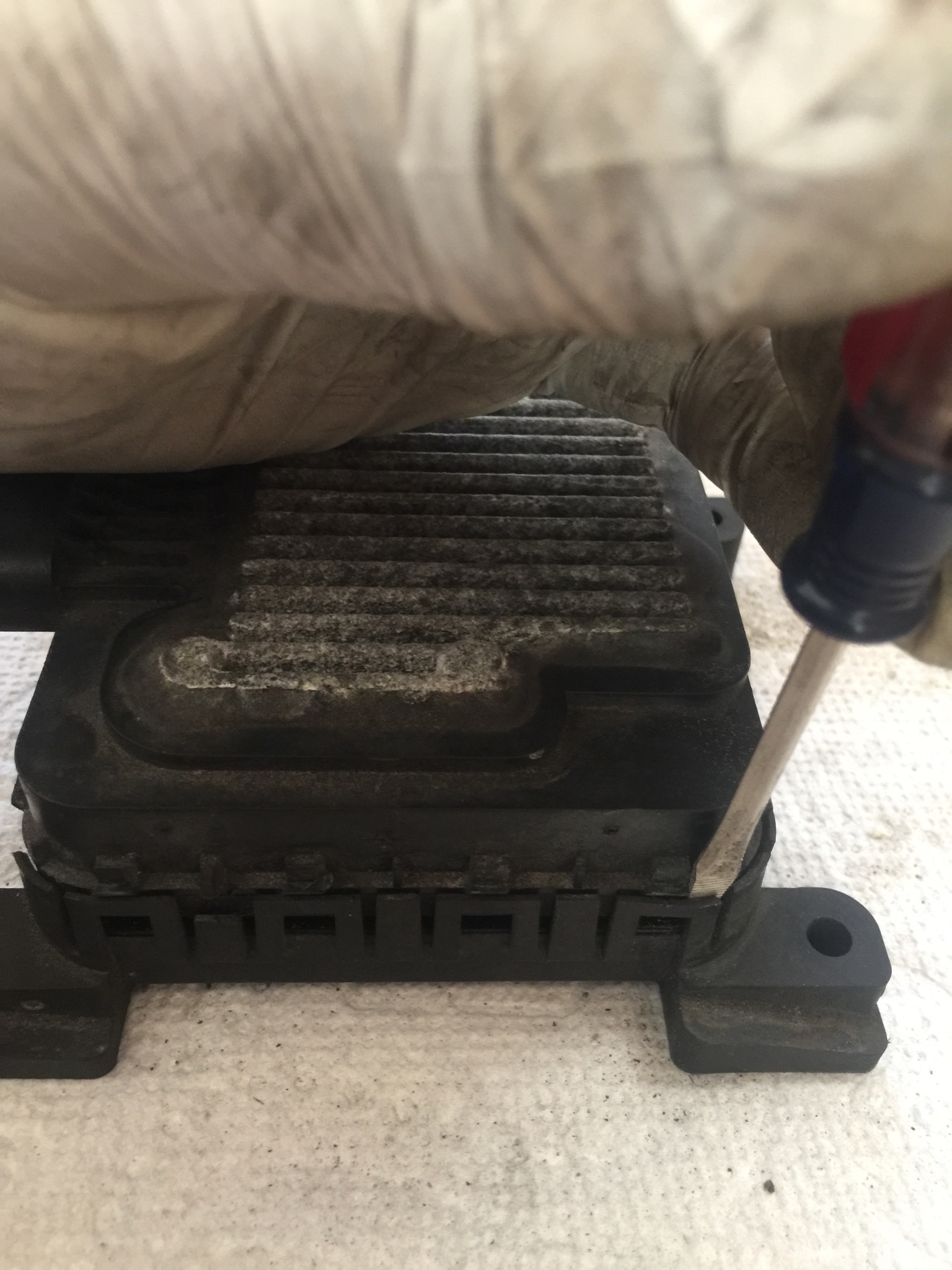On the passenger side, the PEM slides into a mount on top of tank, and is secured by a 7mm hex bolt. Once you loosen this bolt, a metal bracket releases and the PEM slides out. One electrical connector to release on top.