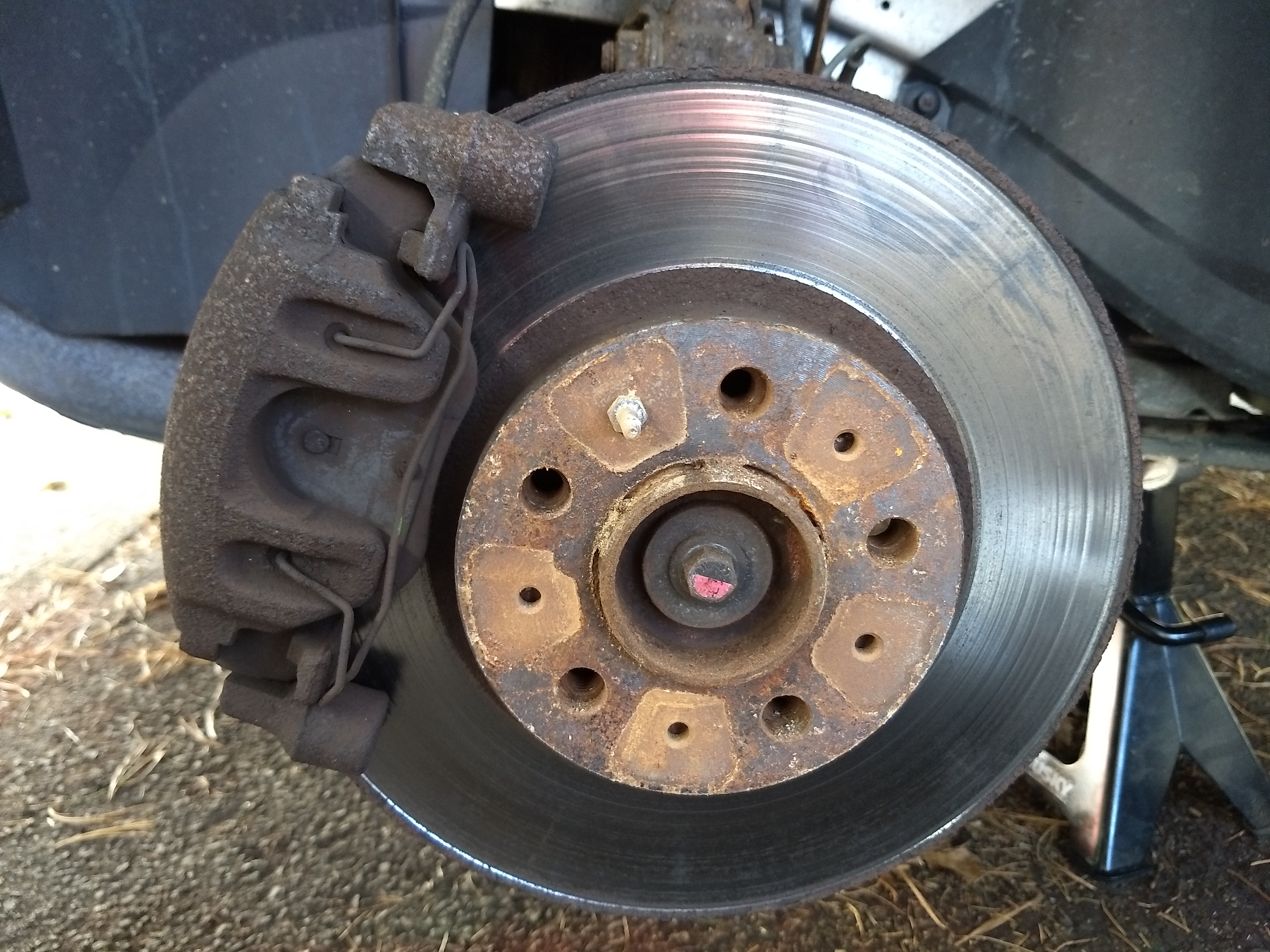 Then the right side guide pin was seized, and it snapped off when trying to remove it. I never understood how much that tiny screw helps align things. (I know, duh!) I gave the caliper bracket a good scrubbing and got it pretty clean. I used the outer brake pad that didn't fit in the left side, and it fit perfectly.