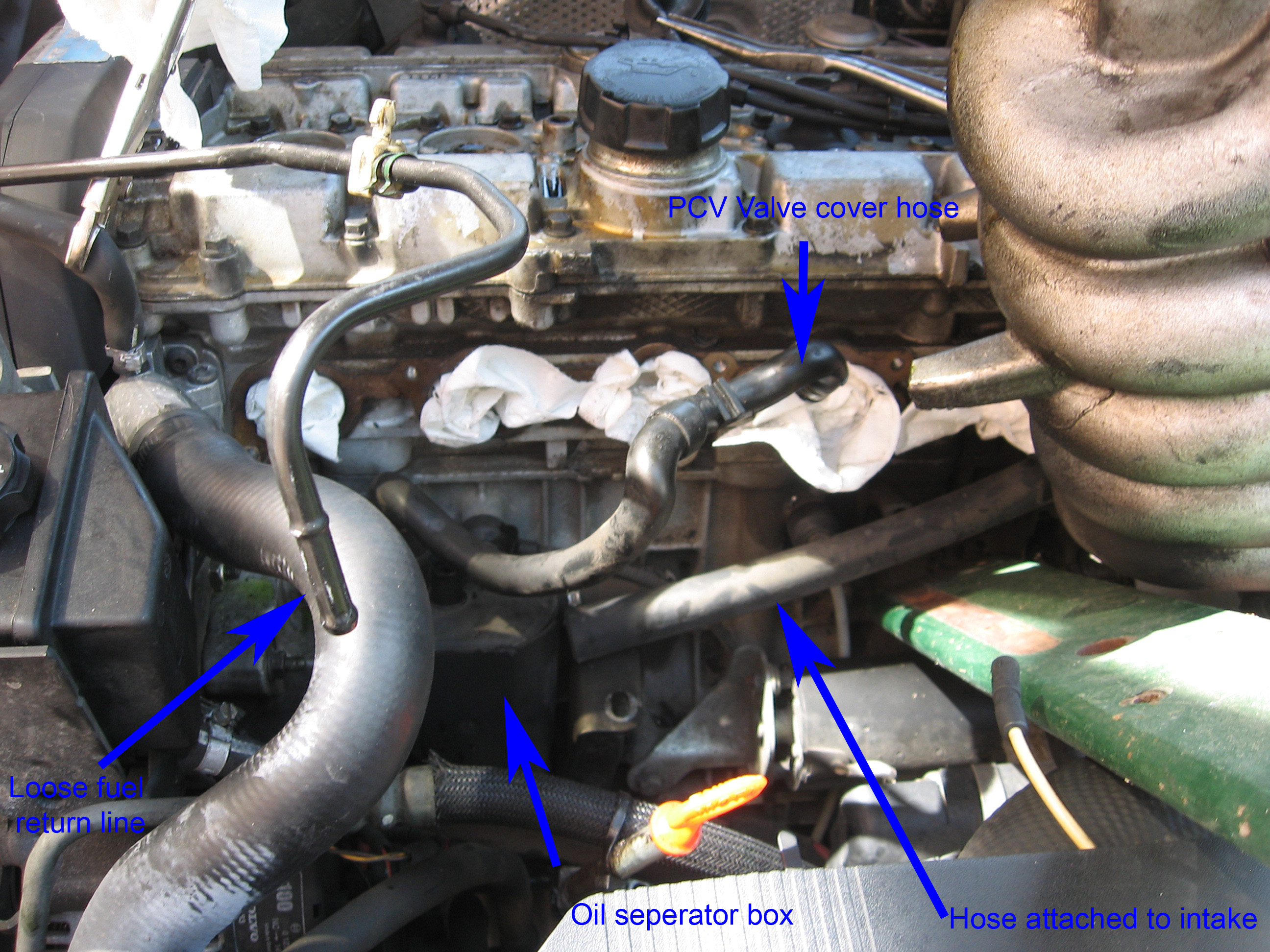 You should now be able to pull off all the hoses (some of mine just snapped right in two) and remove the oil separator. I honestly have no idea how to get to the lower left one, I ended up taking out the right one and got annoyed trying to access the lower bolt and took a crowbar to it, and it came right out.