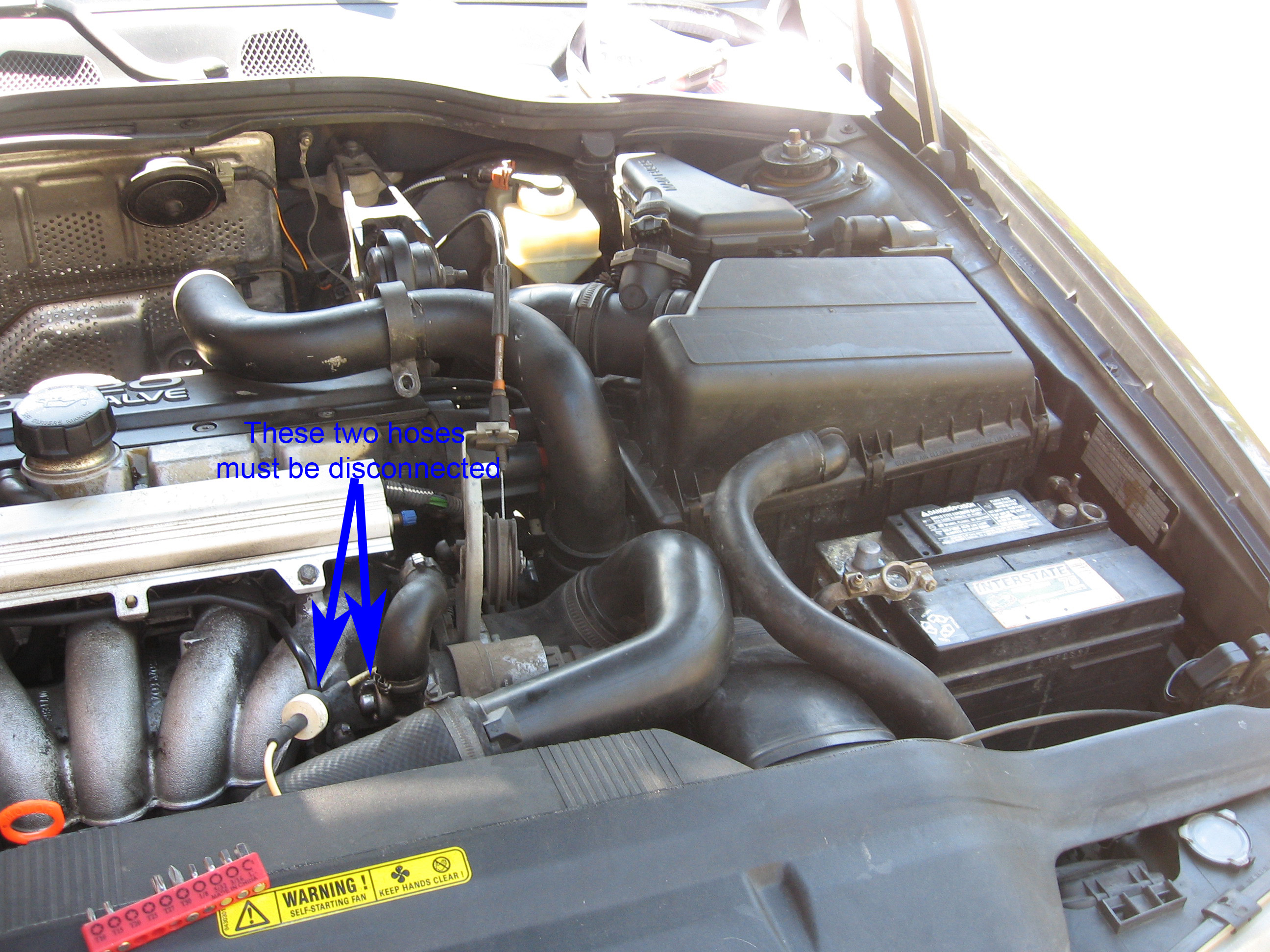 Step 2: Start removing components. I disconnected my battery and removed it from the car for extra space (negative cable first), then the 3 hoses and electrical connector from the back of my air box. Your car may be different here, I have a SAS injection pump, and on non-turbo models, there are two vacuum hoses on the back of the air box. Make note of the orientation of these, they control the air box thermostat flap. If you have never removed the air box before, just disconnect the hoses (two torx screws hold the MAF sensor to the box, the other two pop right off), grab the airbox and shove it towards the engine. This will let go of the clamp holding it to the fender, and then you can lift it right out.
