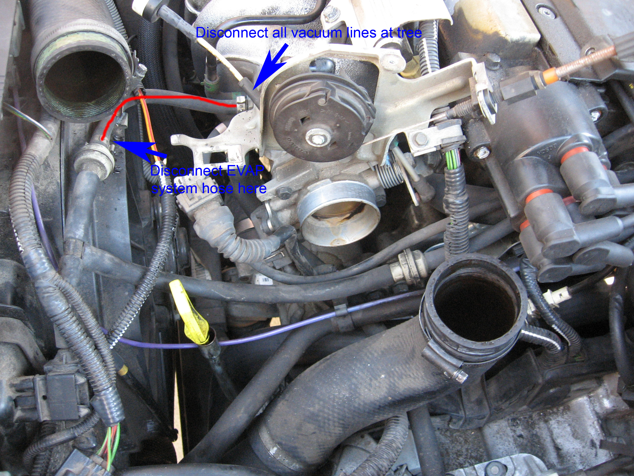 Remove the PCV hose from the top of the engine (twist the clamp off, then pull the hose straight up).