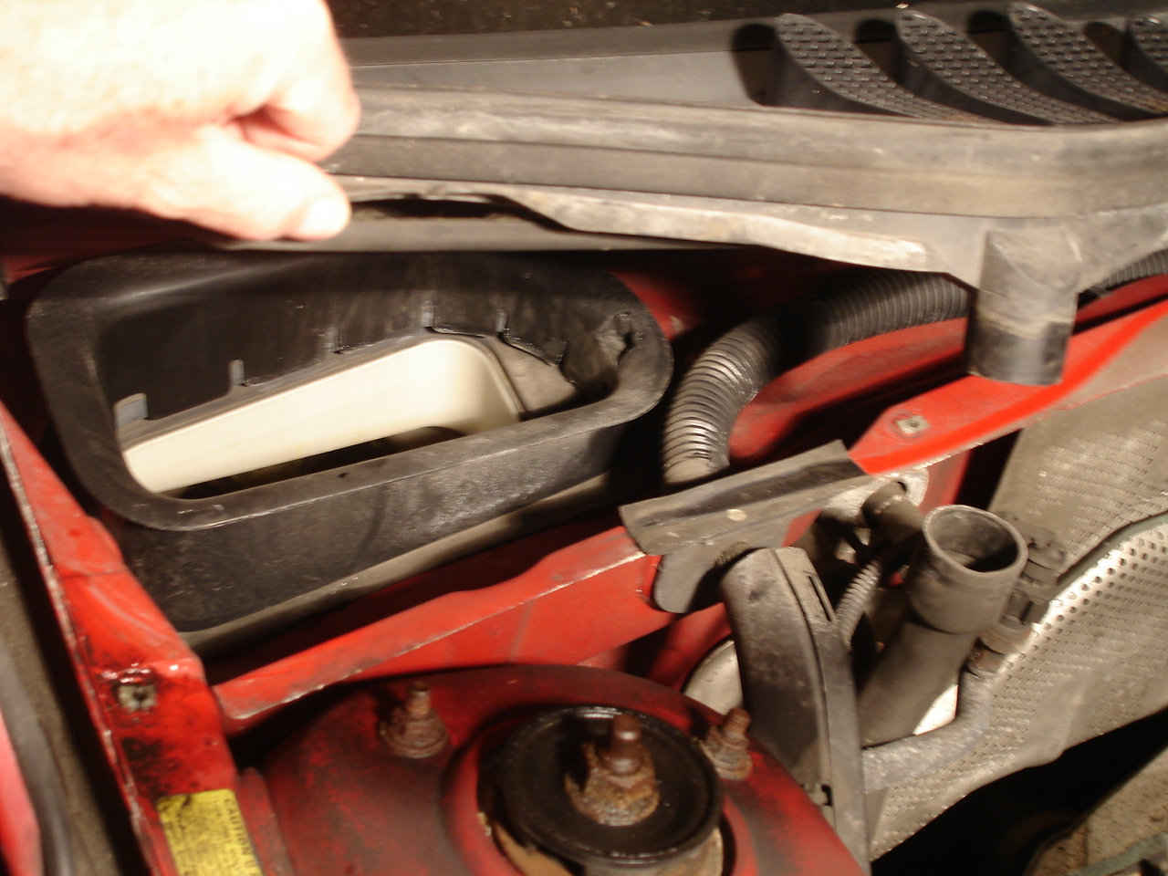 Pull a couple of torx screws from the plastic shroud under the wipers and have a look.