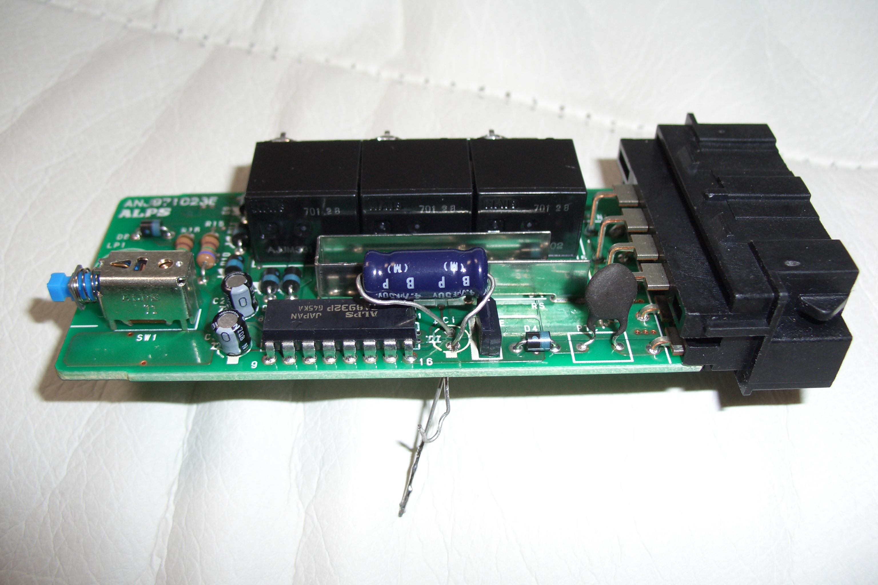 First off, thanks for the great DIY post! It's the only alternative to buying another switch that I've seen. Unfortunately, on my way to Radio Shack to purchase the new capacitor, I realized that it was not at fault for the signal failure. What I did find is that it is one of the three relays that is at fault (the far left one in your pic). When I pressed on it, the hazards started to flash again and then promptly shut off again. So I continued on to Radio Shack just in case and then to my local auto parts store to see if they had any relays on hand. Not finding any, I came back home to see if you might have any advice on where to find one and/or how to go about replacing/repairing it. As for removal, I can see the obvious connections on the top side of the board, but I'm not sure if there are any to the bottom that I need to be wary of.