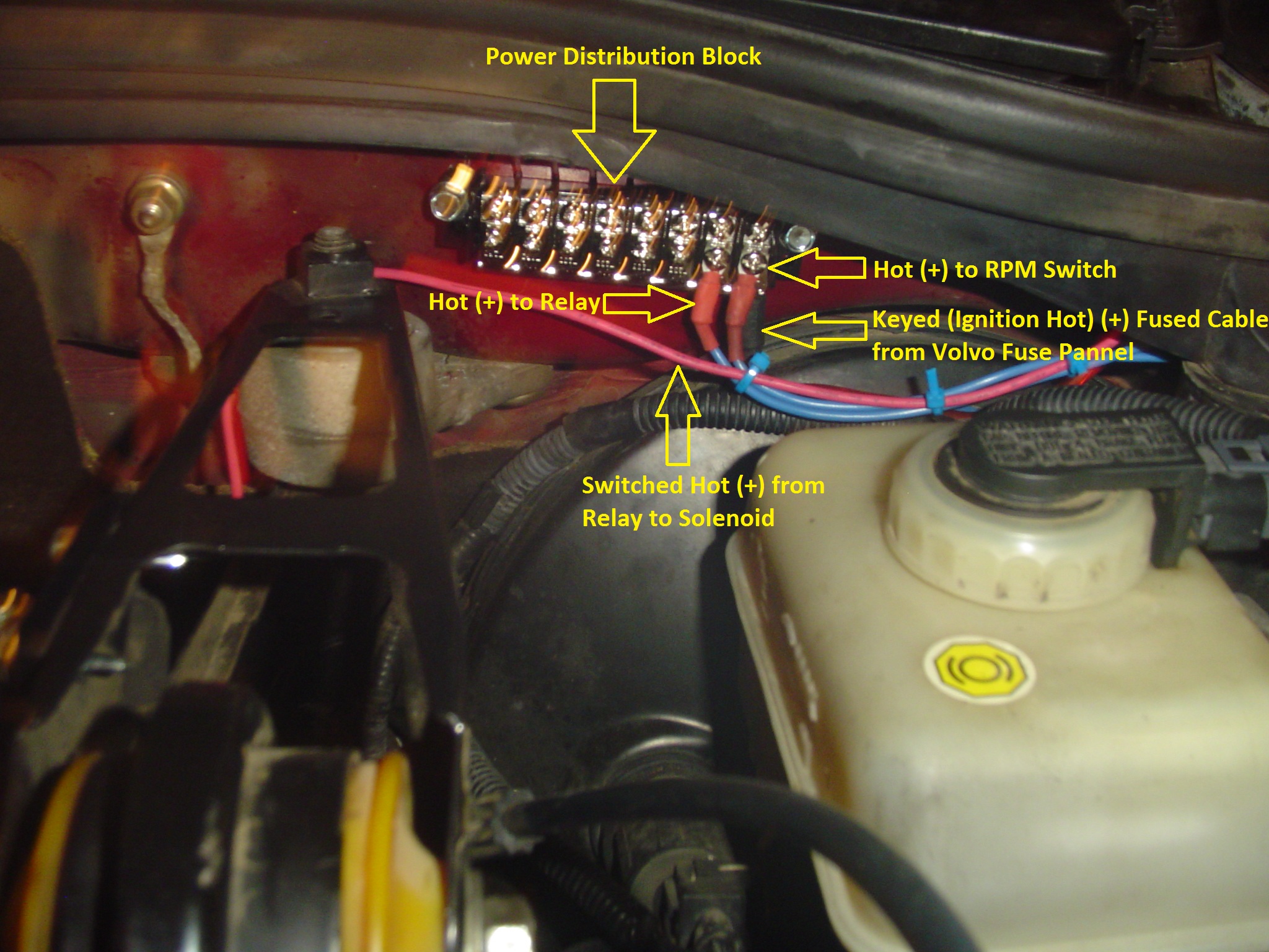 This is a pretty neat apparatus. It's adjustable for a pretty broad range of RPMs and can be set to either turn something on or off at a determined RPM. I of course have it set to turn off at 3700 RPM, this RPM was determined based on my finely tuned "seat-of-the-pants" dyno :lol:. The RPM switch is calibrated for use on 4, 6, 8, and 10 cylinder engines, the Volvo 5 cylinder gets no love. I originally thought I'd set it for a 10 cylinder and multiply by 2, but my theory wasn't panning out. I wound up setting it for a 4 cylinder and began trial & error testing. Turns out that set as a 4 cylinder and to turn off @ 5600 RPM is about 3700-3800 RPM according to my car's factory tachometer. I know there's some error/variability in both the switch and factory tach reading, but at least I've got a base line to go off of. The green LED comes on to show that the switch is receiving power, and the blue LED let's you know if the switched ground for what ever you're controlling is open or closed, i.e. blue LED on the switch is closed/on, blue LED off the switch is open/off.