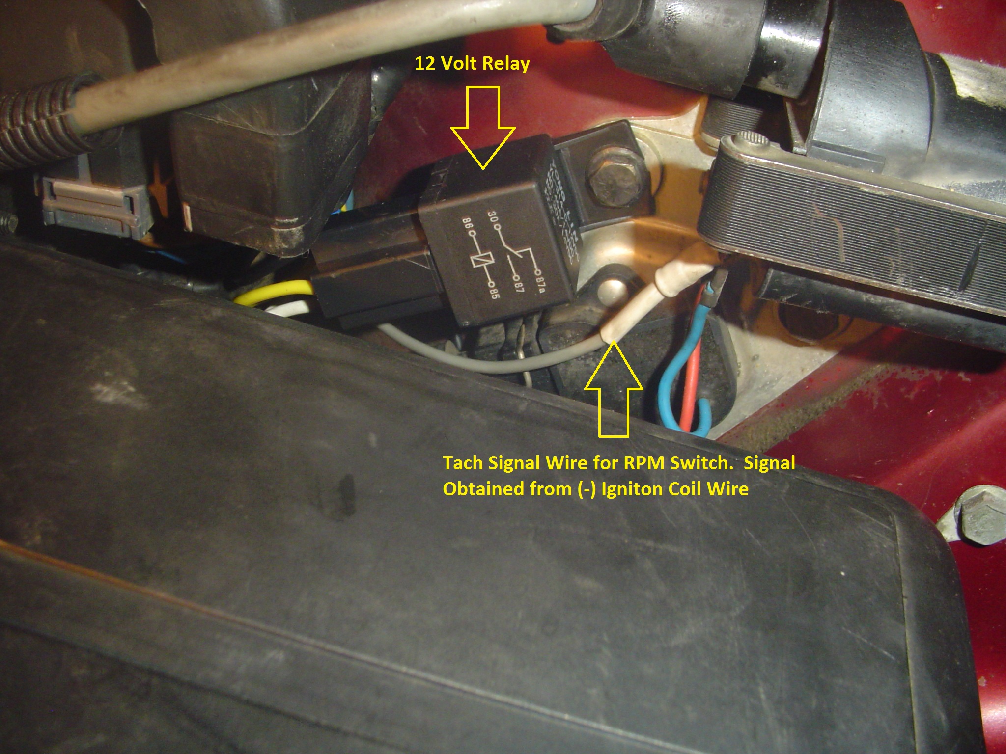 The Pièce de résistance, with out this little guy, none of this would work. The RPM switch. I mounted it up out of the way on the bracketry that the ABS computer mounts to, driver side strut tower, well driver side for those who drive on the correct side of the road :wink:.