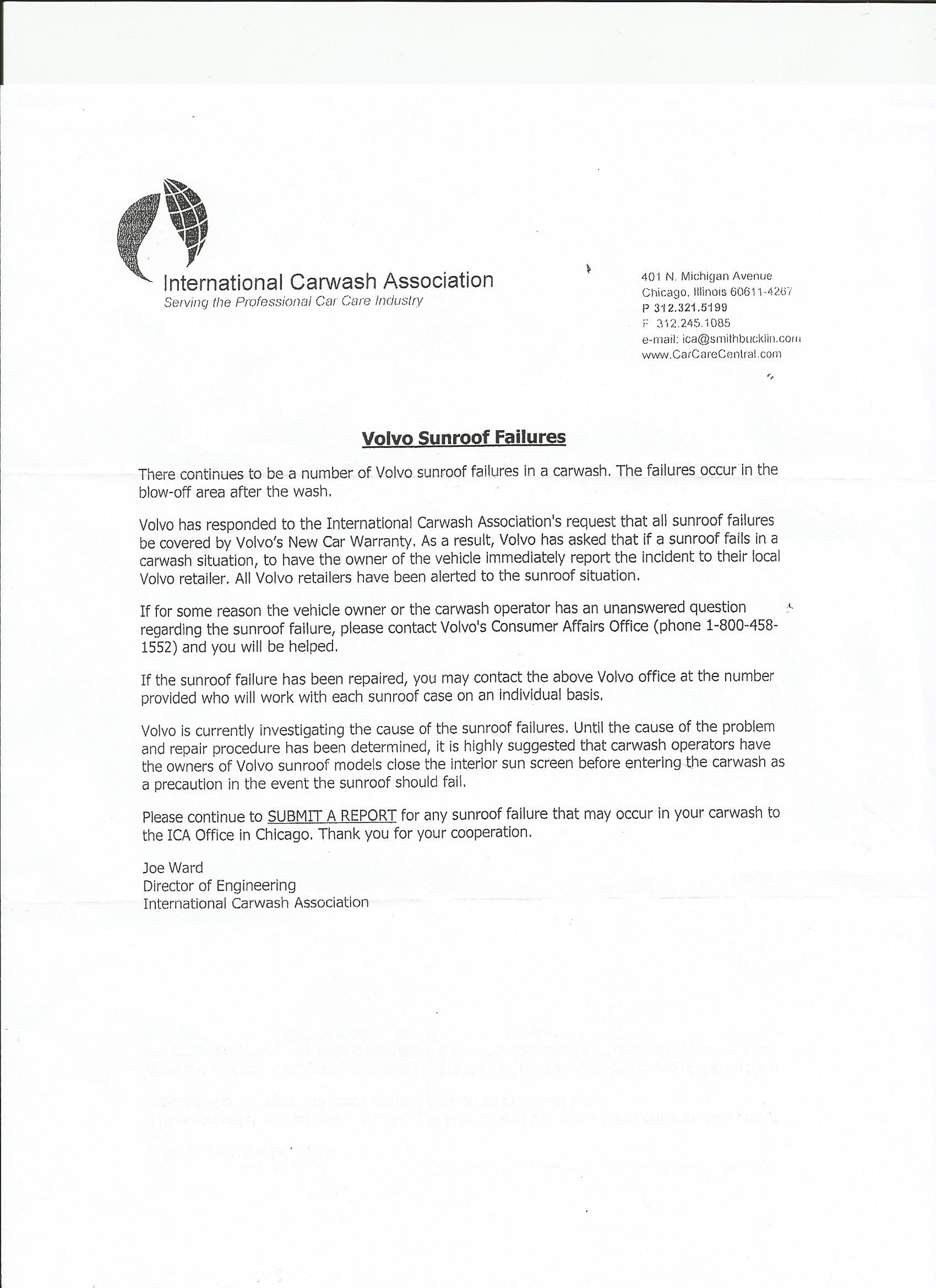 Something I want to point out, how the letter states ALL Volvo retailers have been alerted (see they wont agree to this unless you know about it) and also Volvo New Car Warranty, My Volvo is a 1999 far far from new, if it happened at the carwash and its the original glass, Volvo would replace it. Hope this is helpful to anyone if you ever come across this issue.
