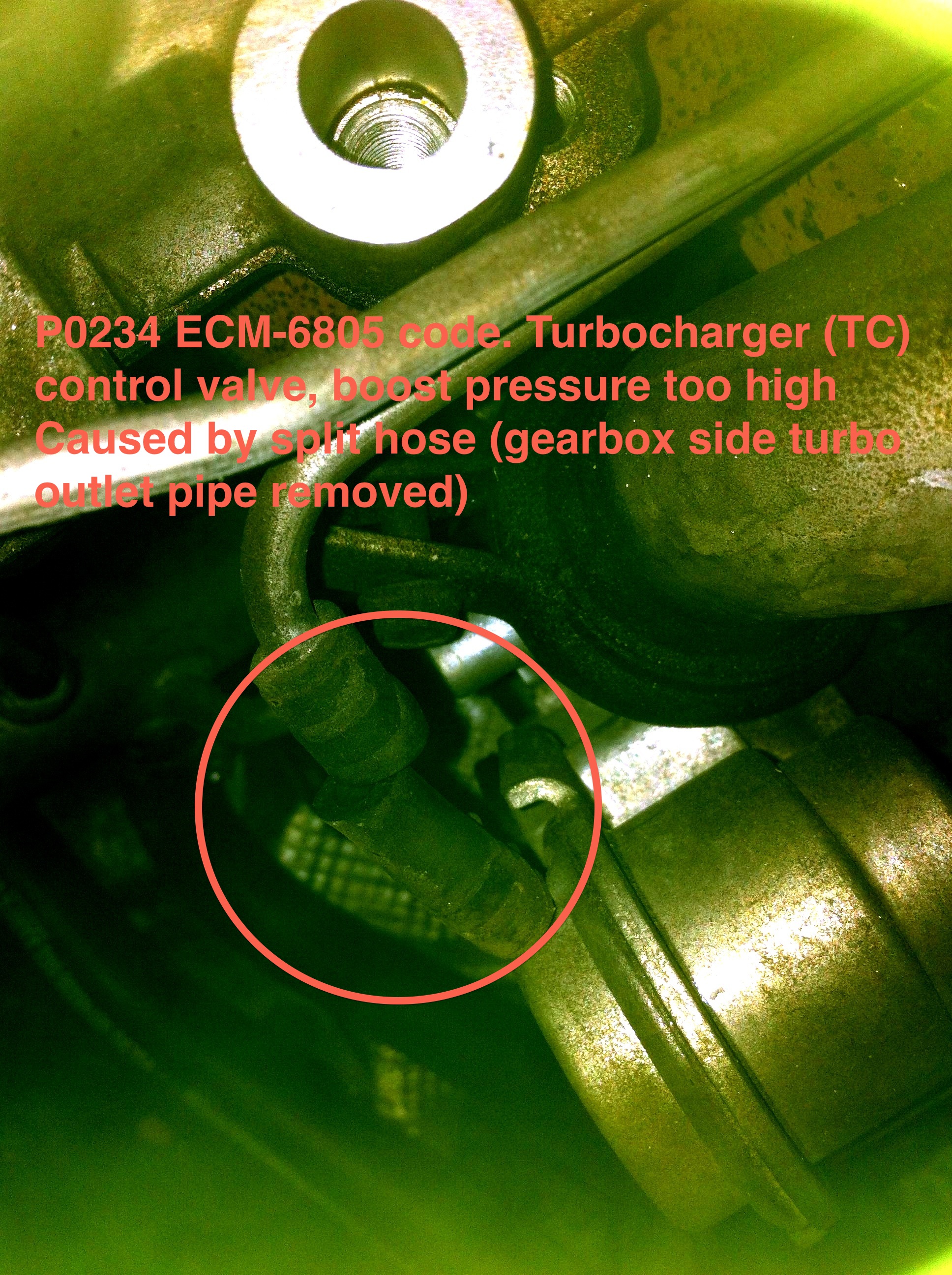 While dismantling the car to replace the heater hoses, replace the water pump, upgrade the control arm bushes to urethane, fix the brake pedal position sensor and fix the oil leaks (typical weekend for an S80 ;-), I took a look at the vacuum hose on the turbo itself (gearbox end) and found this: