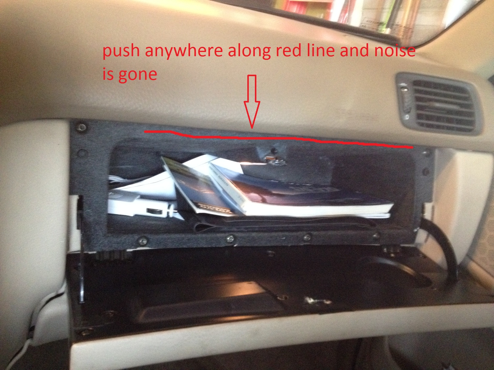 When i open my glove box and push anywhere along the red line I drew at the top of the glove box the major squeaking noise disapears. Therefore, I was thinking of adding some self taping screws along this red line. To ensure the door closes, I will put the head of the screw on my bench grinder to make them low profile.