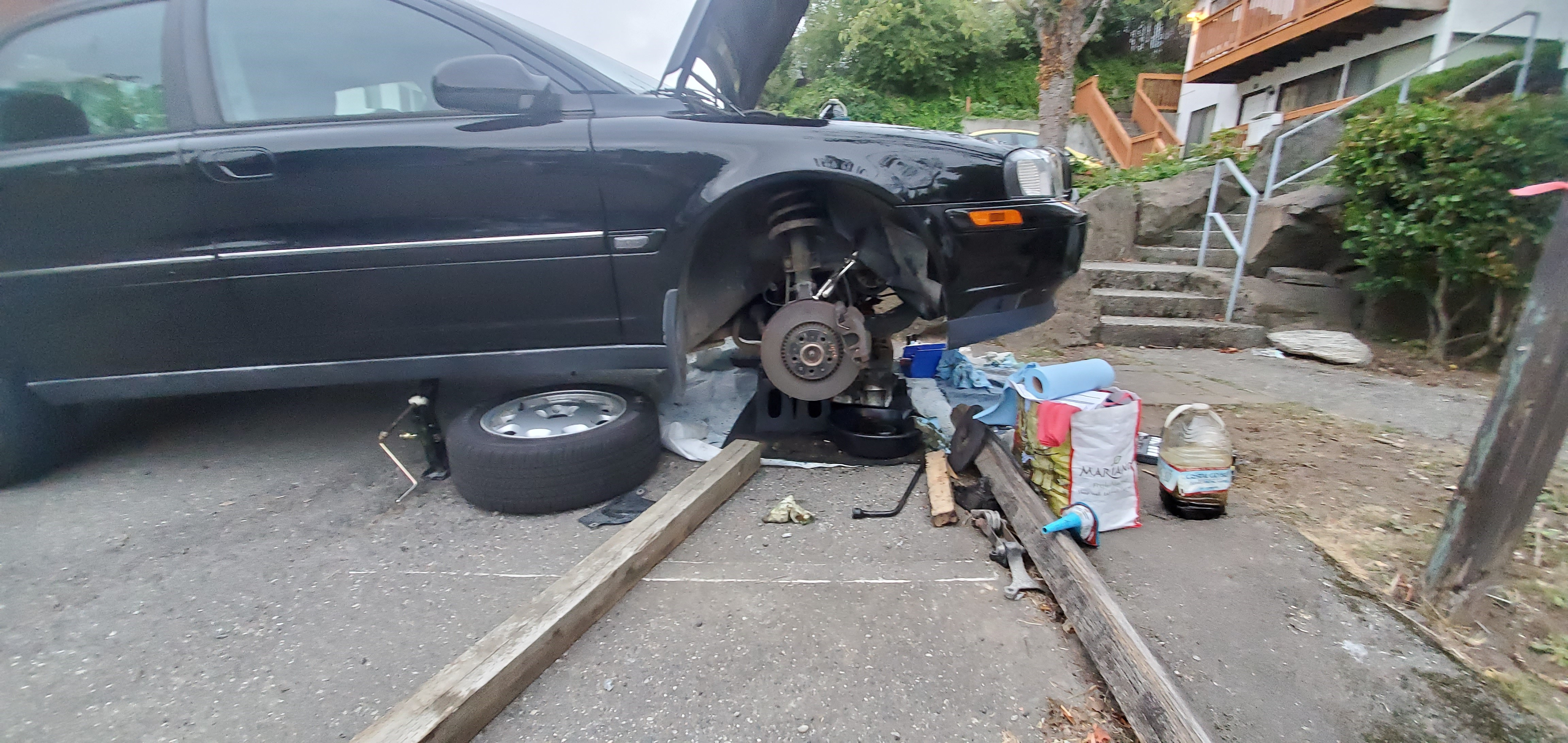 That didnt stop us (2 adults and 2 kids) moving from Illinois to Washington... with a trailer through mountains: My 1st atempt to take pan out failed due to frame in the way, I was already counting the money to pay the repair guy. Afte bolting all back I heard a loud rambling noise. I found out later it was one of the long bolt near the tran that I missed the hole, this mistake made me actually to finish the DIY project: It took me about 2 weeks to fiish, after work or in weekends: The "Hidden" pie shaped hole: Harmonic balancer off (only the disc), to get access to engine mount: Thanks to this forum and Hitchensthinksnot the oil pan was out without dropping subframe: