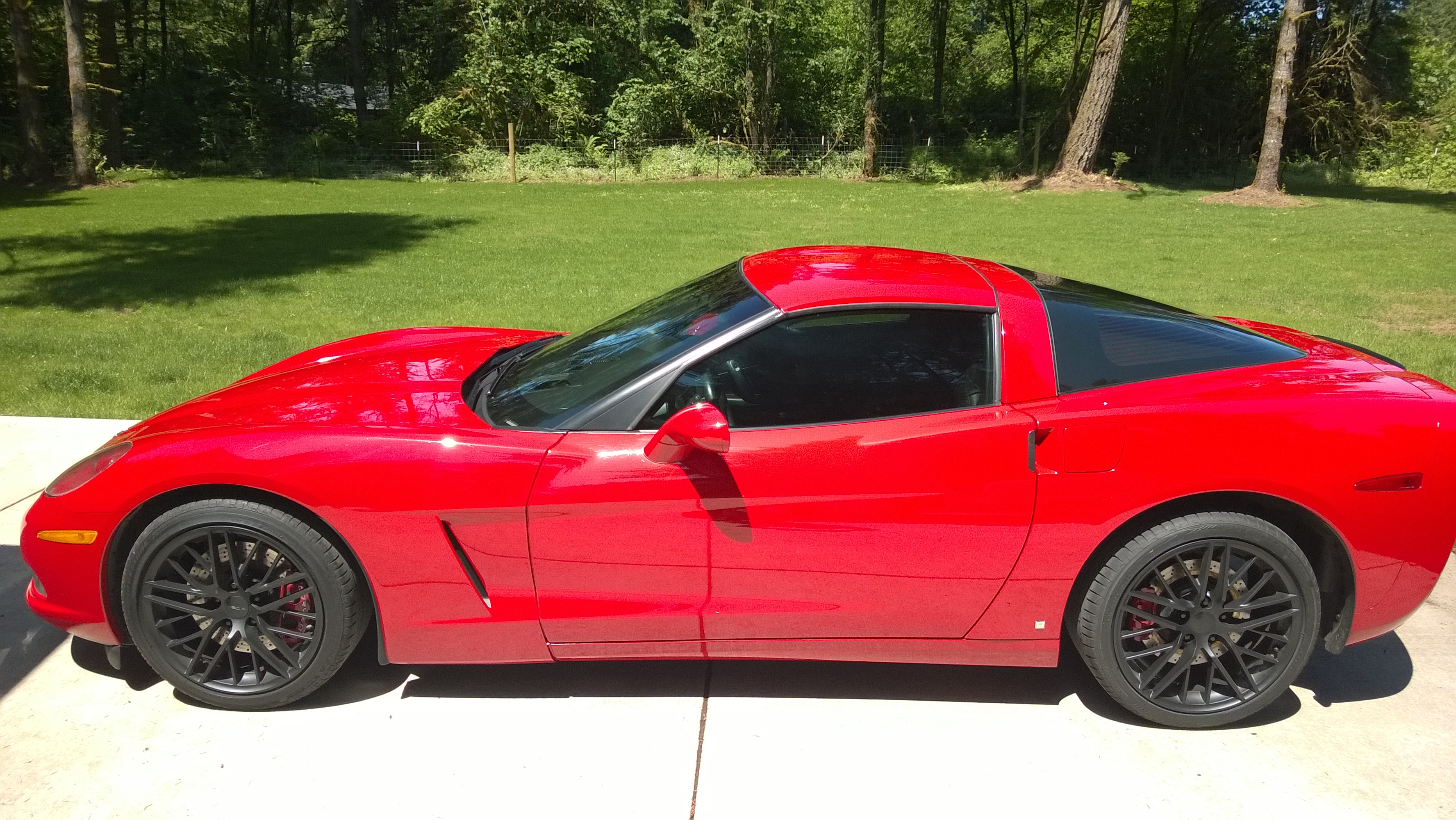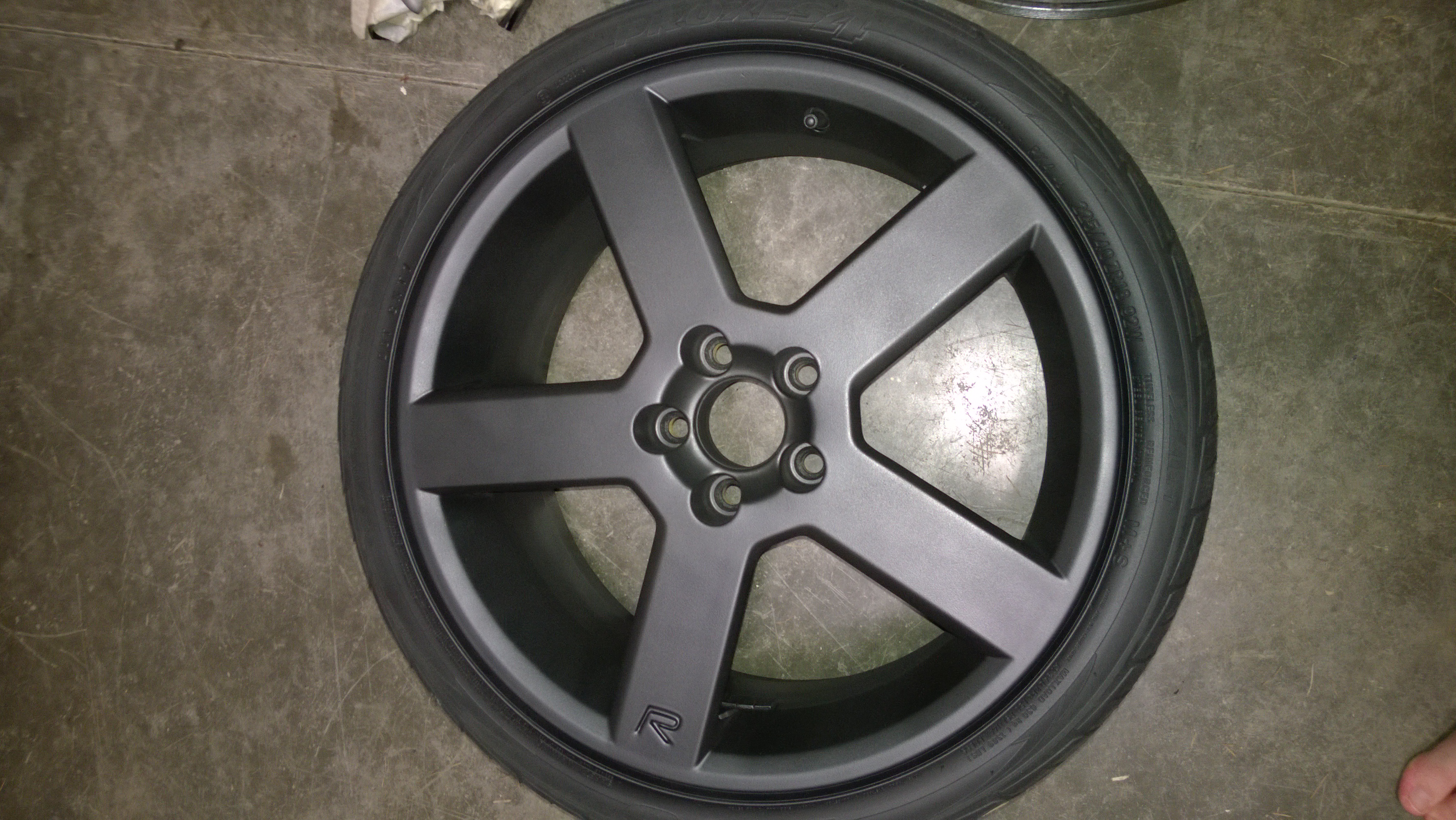 So I purchased a 1999 V70r that had a blown head gasket as a project to kill some time. The car is in pretty great shape, but the wheels were curbed up like they let a blind guy parallel park for them. I have only repaired wheels once before, and this is certainly something that gets easier and looks better with practice. I even left the tires on when I did the repairs, just deflated them all the way. To start, I took the wheels of the car and cleaned them up completely. No brake dust or grease or anything. Then I took some 120 grit then 220 grit sandpaper and knocked down all the sharp edges left from the curbing. I then took some glazing/spot putty (Pretty much bondo) and filled in around all the edges. I let the putty dry completely and sanded with 220 grit and did again. After sanding the second round, I took some self etching primer and shot the whole wheel with it. Once that dried, a little filler primer to get rid of any remaining sanding marks. I took 800 grit sandpaper and went of the whole wheel to get any high spots. They were then ready for paint. I happened to have a few cans of semi gloss black header paint in my garage, so I just used those up. Turned out pretty good. I then plasti-dipped the wheels in black. The plasti-dip allowed me to hide any remaining imperfections on the wheels. I have to say I like it. Red with black wheels is kinda my thing, and I do it on most of my red cars, even though it is getting a little played out, I still like the look. Here are a few shots of the wheels. Not very many, mainly just some progress photos.