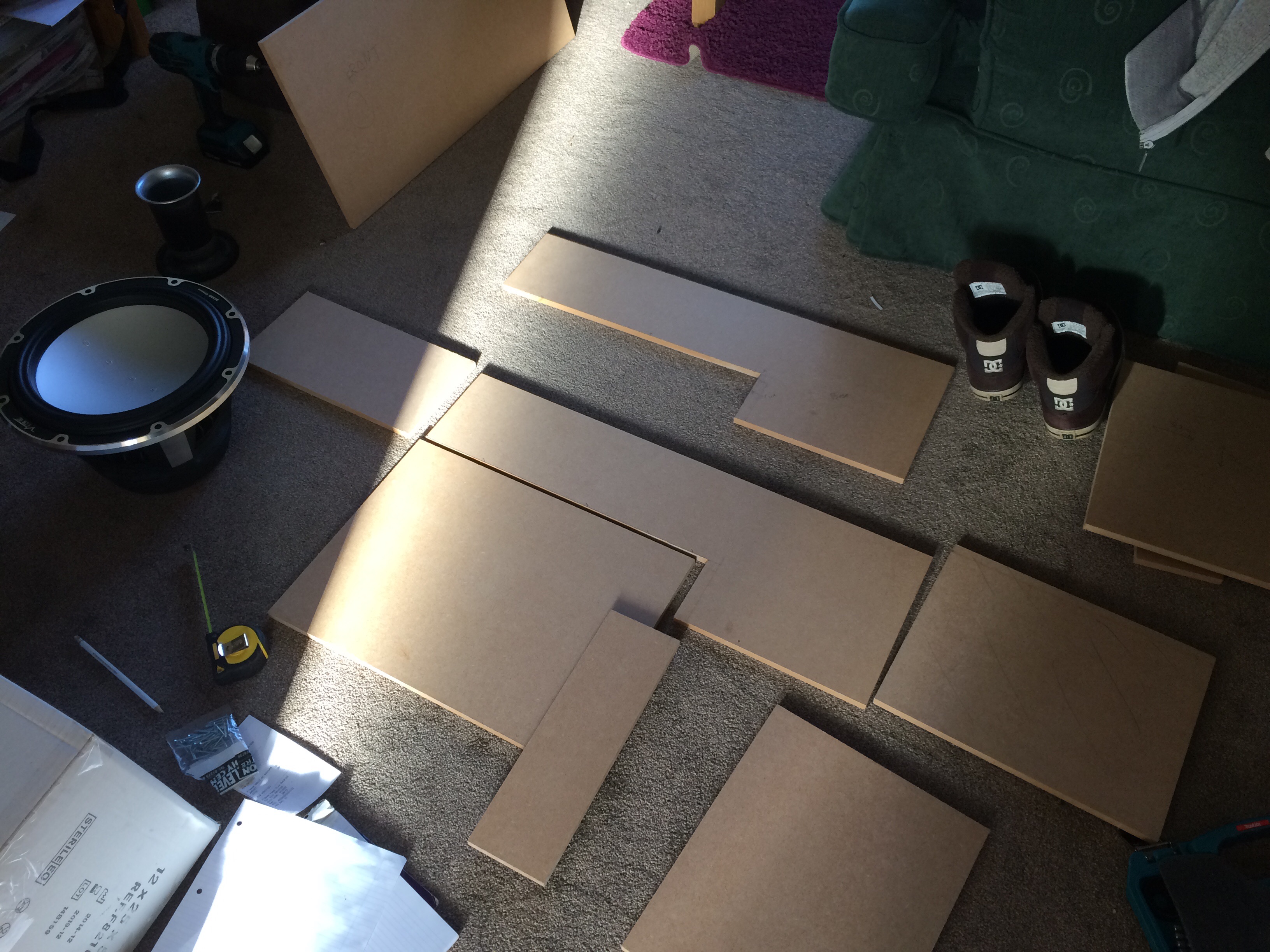 So basically I like my boot and so wanted to be able to still get things in so decided to try my hand at my own style build. I used (slightly too thin really for best sound) 12.5mm I think it was mdf. This was partly due to cost and also weight/sub fitting space as the shape of the box is very tight on the magnet and spider of the space sub.
