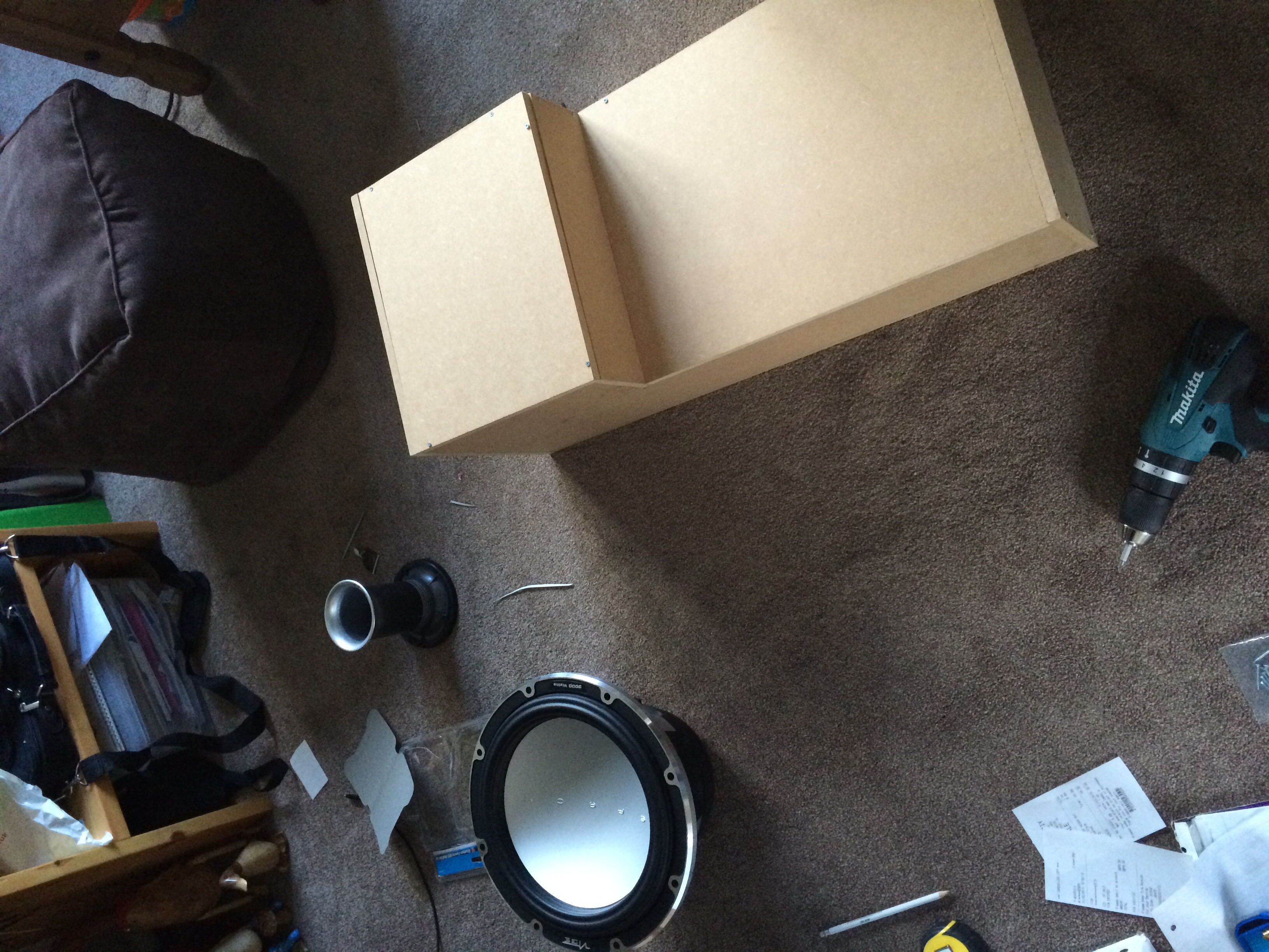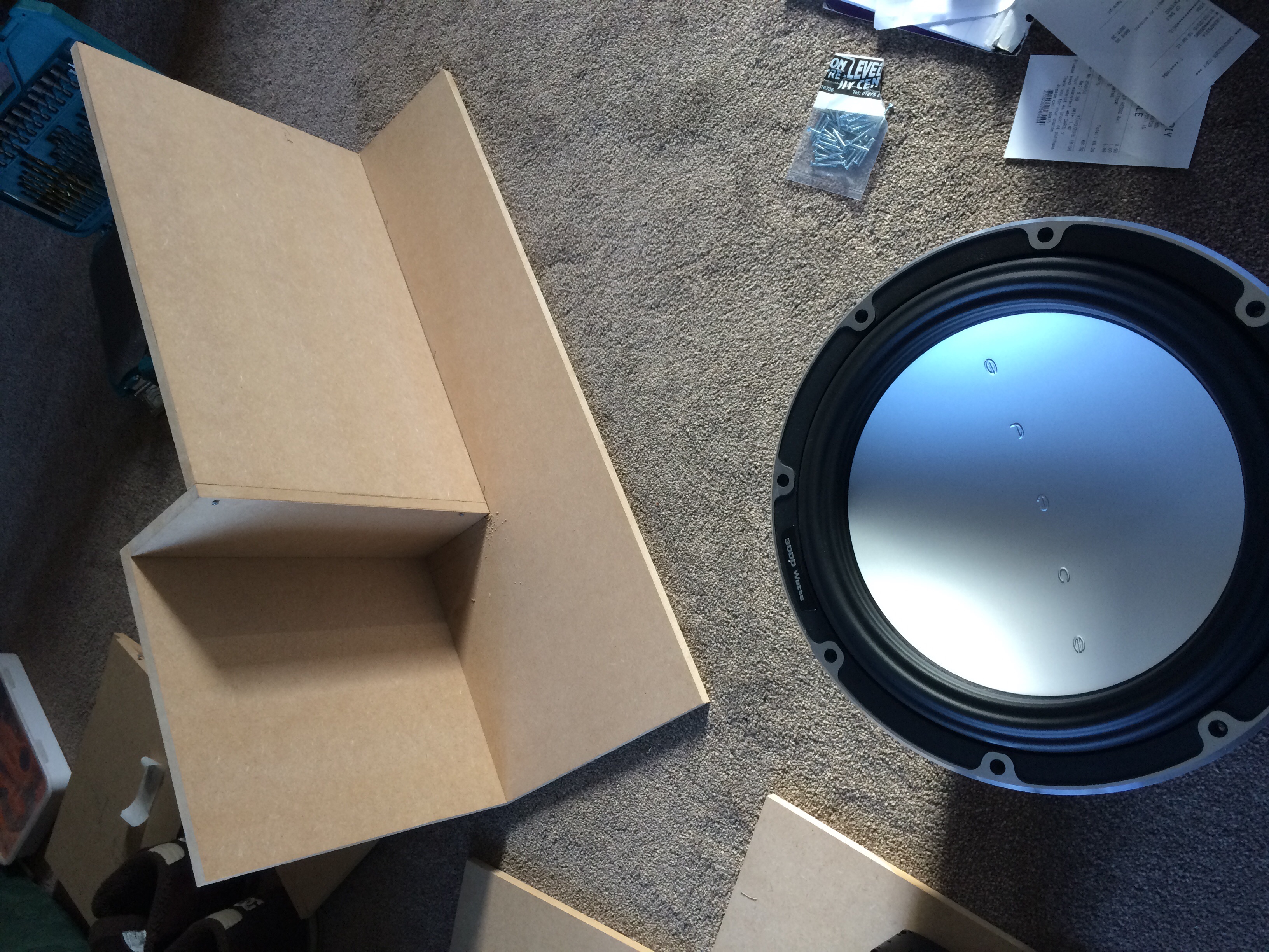Wood was cut at my local diy shope which made a HUGE difference and I would recommend, cost a few quid but edges were square and straight so went together easy. I then cut pilot holes for the screws and slowly glued and screwed it all together. Before the front was secured I added some foam to the inside and spray glued it in, cut holes for the sub and vents and power (pain in the bum if you don't have a large hole cutter or jigsaw!) and sealed the joints with silicone to avoid air loss.