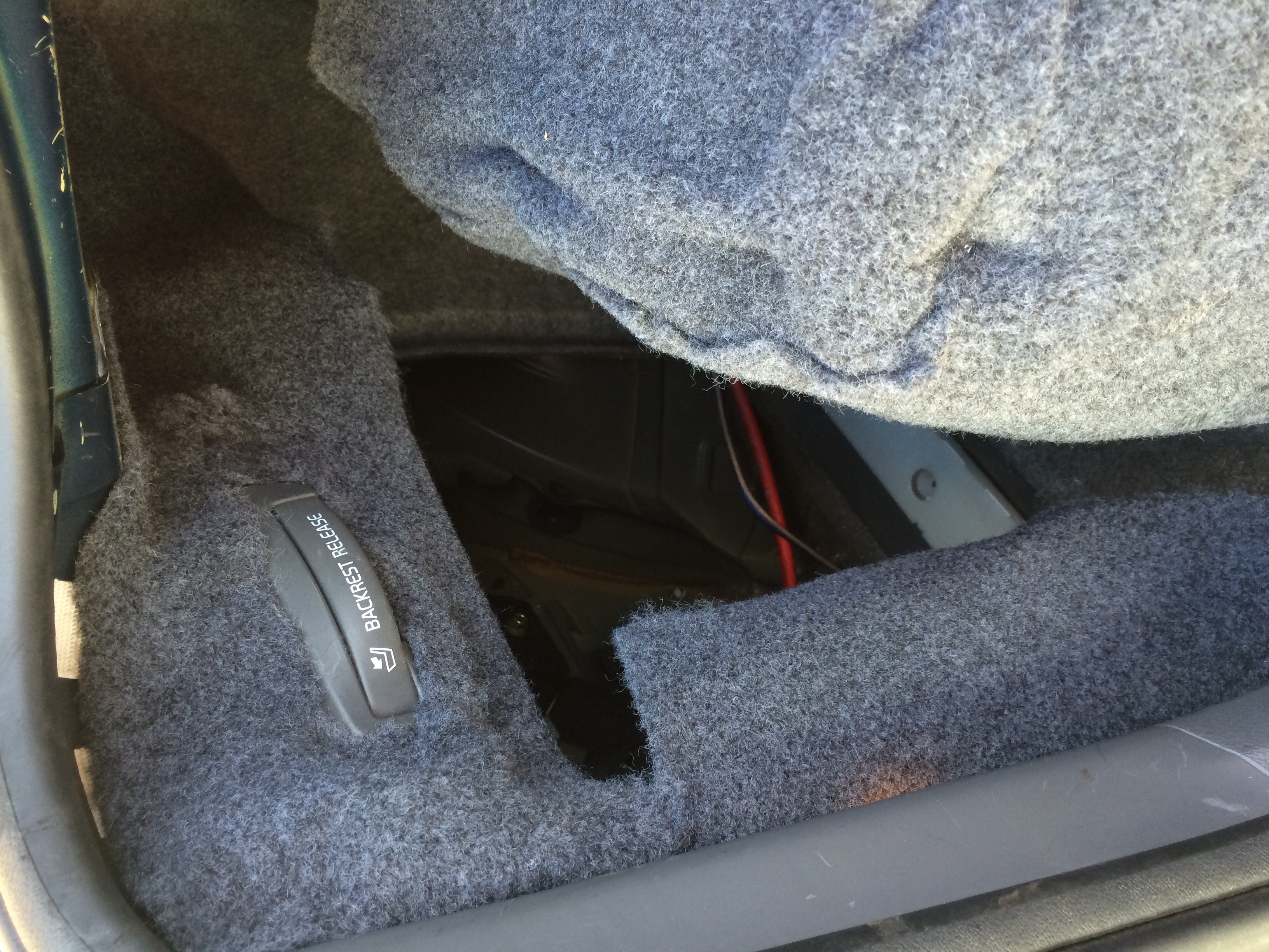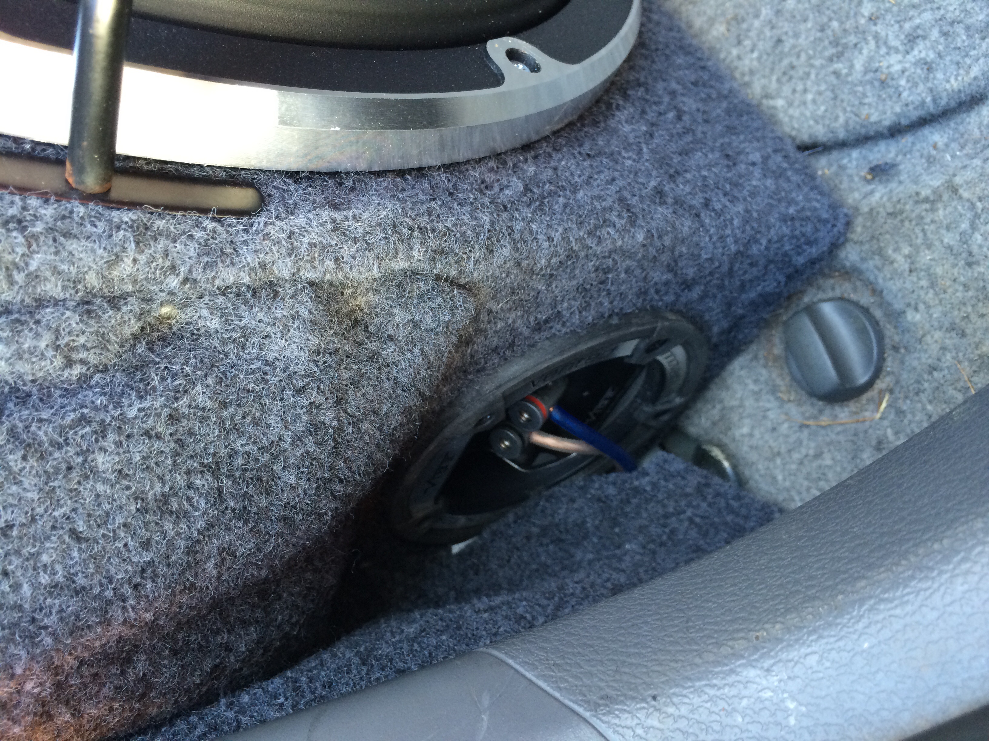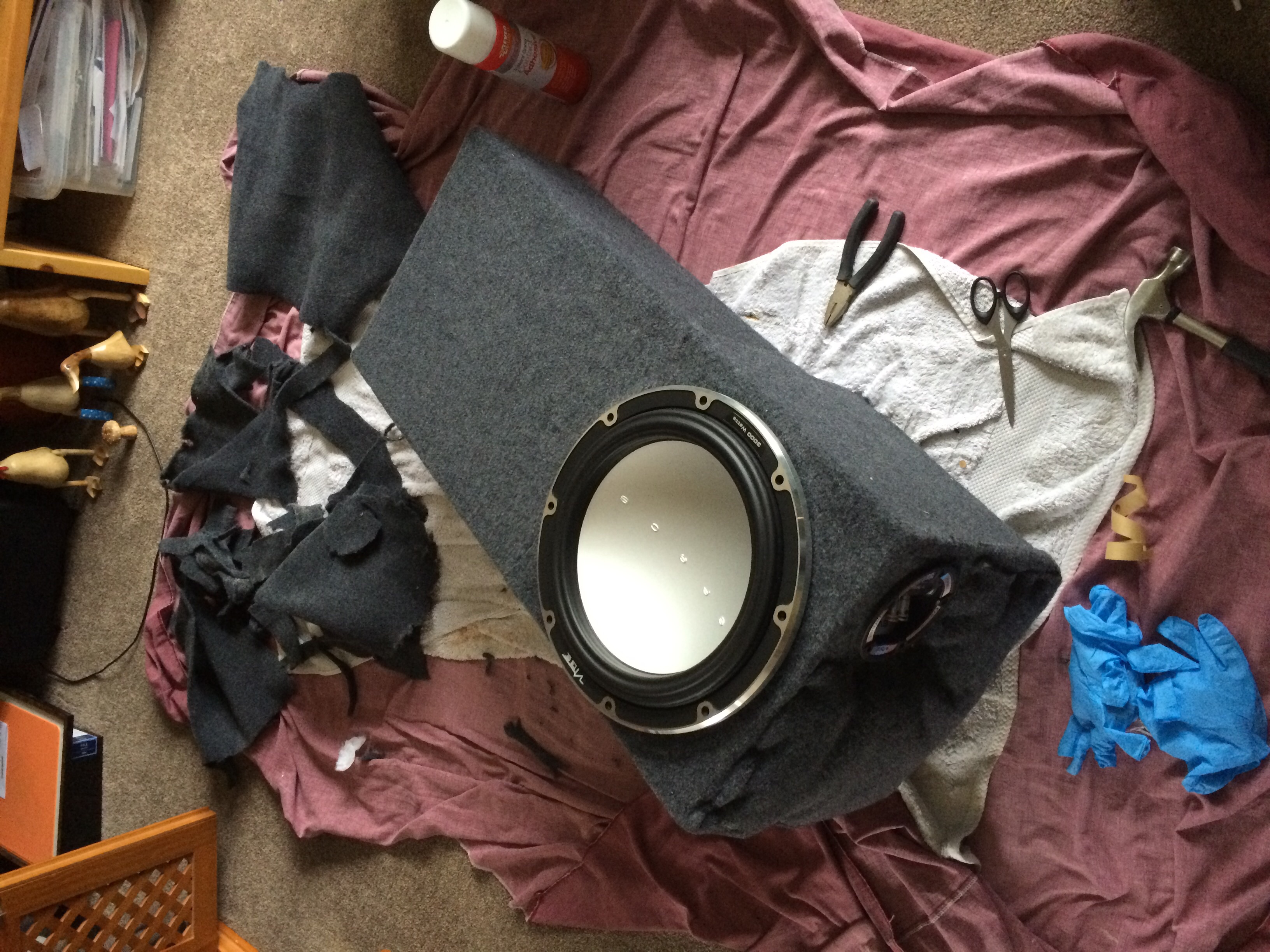 To make tidy in the car I simply cut a larger section of the remaining carpet and used velcrow strips to secure in place on various parts of the boot structure. This seemed to work well and was very cheap. I wanted to have something that made removal easy as I use my boot for bikes etc but blend it all in fairly well. Tried fiberglass but too hard and messy for me! Speaker grill was from ebay and arrived from America for free within 5 days well impressed! Not yet tested cone excursion on it but I think it will be large enough.