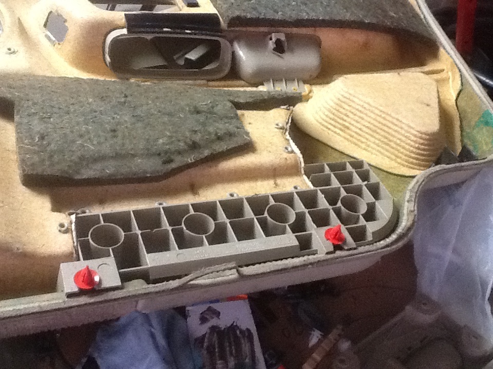 You can see the plastic part from the door handle. One is missing a piece. Either pry from the back and/or push forward as you remove so that little tab doesn't break. Picture of locking part. The wire is either broken or has come loose. The handle end looked a little more technical to get into. The red things are what you are trying to remove to remove door panel. There are more than I am showing.