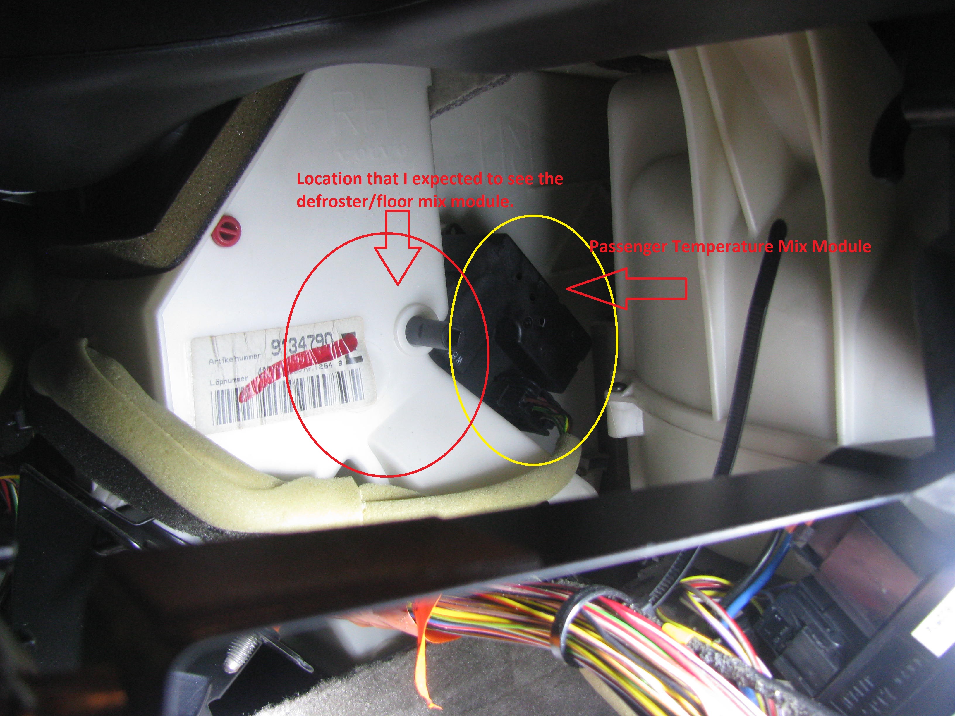 Hi All, I always use MVS, but this is my first post. I'm not getting any heat to the floor, or heat to the windshield for defrost. I've been all through MVS to find possible problems. At this point, I can't even locate the Defrost/Floor damper motor to determine if it's defective.