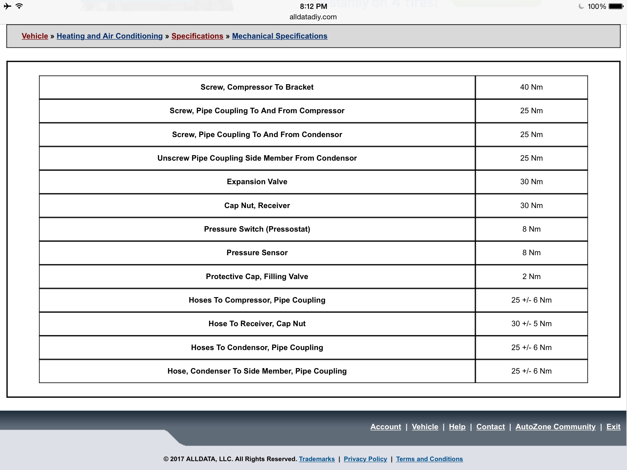 That torque value for the line at the compressor sounds like double a standard M6 bolt! I'm looking all over too. Let you know what I find