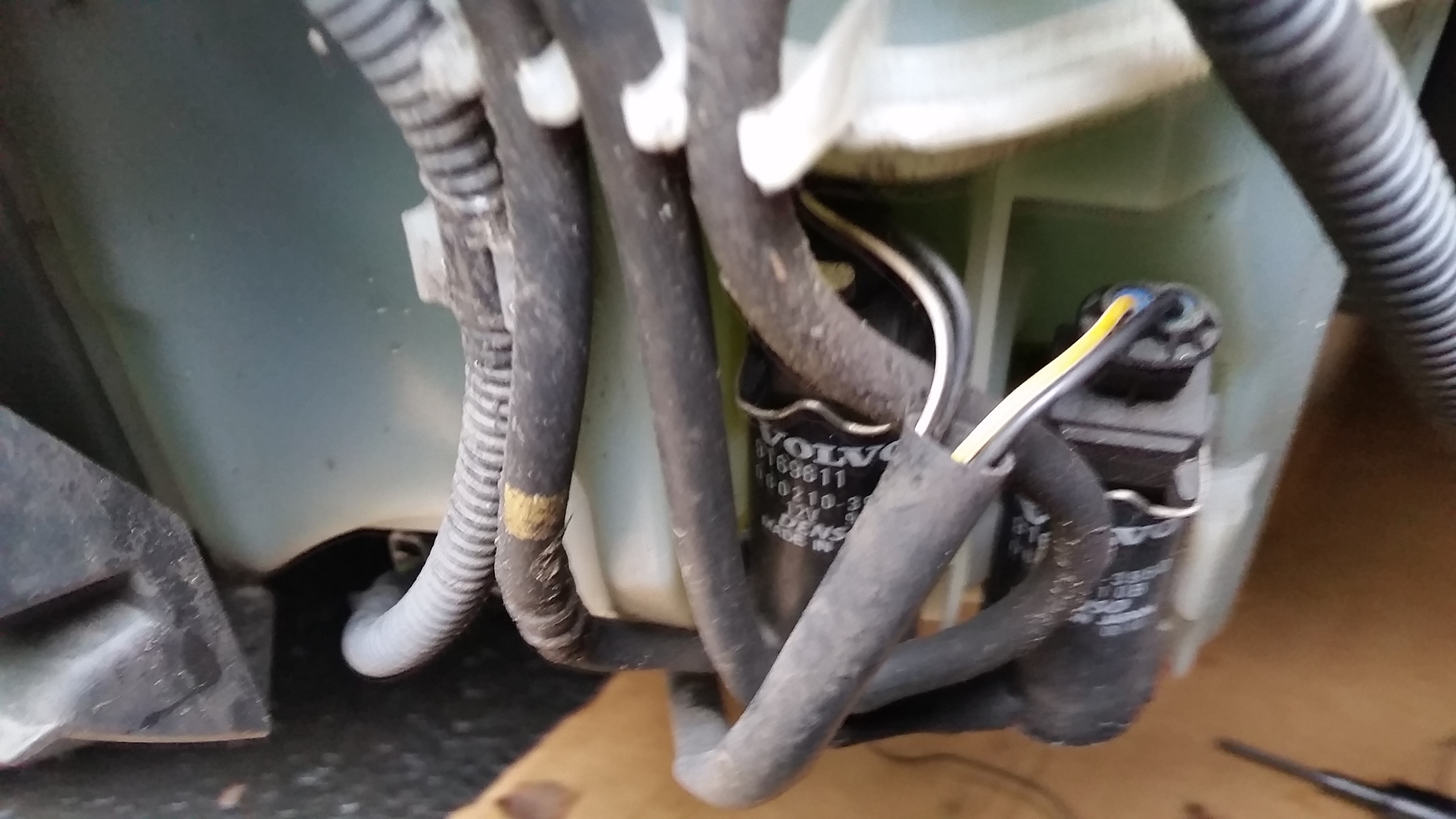 The wire is crimped onto a connector that goes into the black plug, which is later filled with hard epoxy like glue to make it water tight. If it was me, I'd try with a very small drill bit to carefully get about 1 cm of the blue stuff out from around where the wire broke and hope the copper wire in the plug can take a bit of solder... If that's the case, it should be easy to mend the two. For kicks, try disconnect the wire harness from the pumps and put a 12v supply directly on them to see if the fault is in the wiring or the pumps. Seems weird to me they would both just go out like so. Could be a small blockage in the hoses or maybe the filter at the bottom of the resevoir is jam-packed with debris that would cause the pumps to work much harder to pump the fluid through to the nozzles.