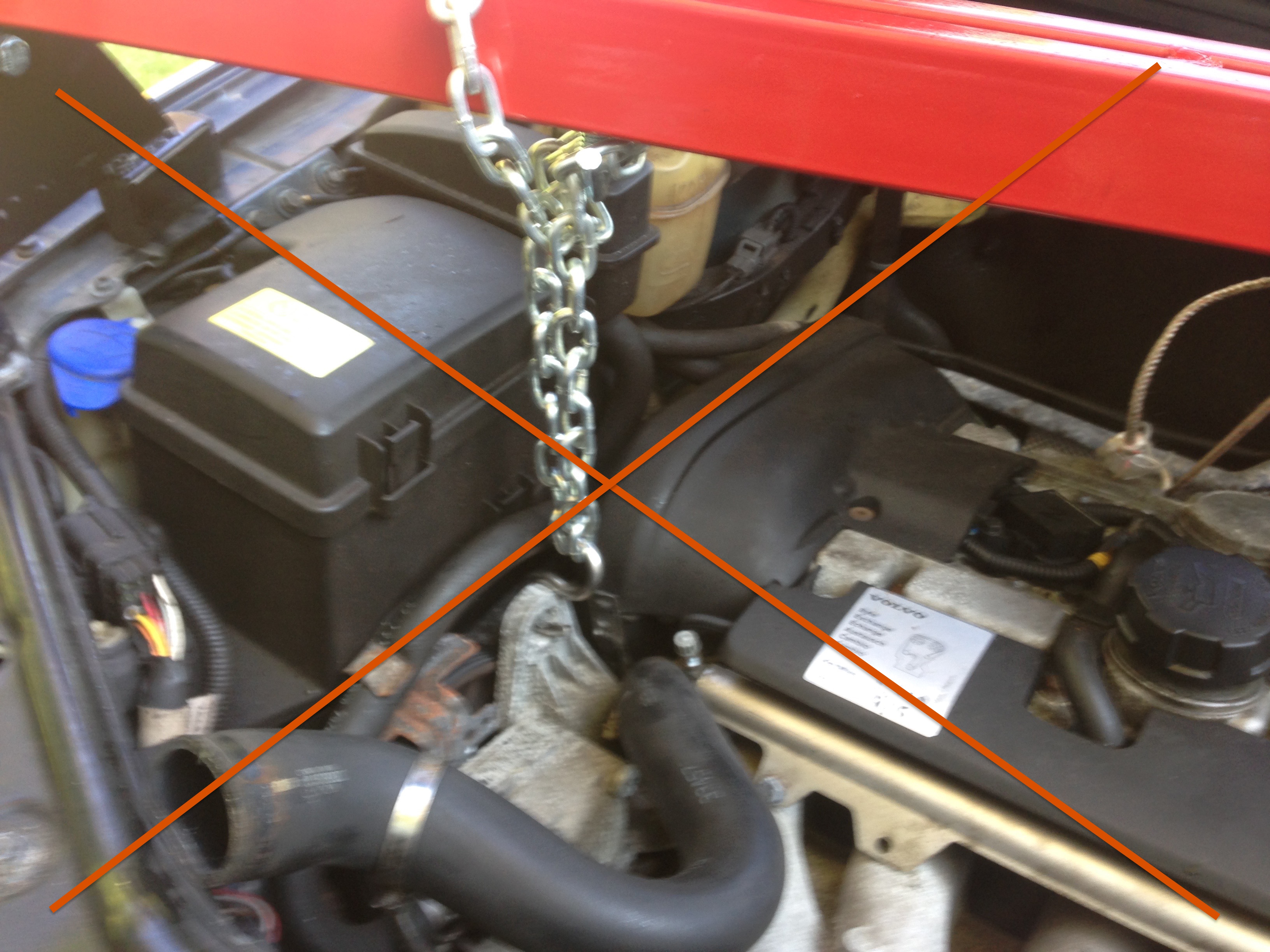 The hook slipped off and luckily I had lumber under the motor so it fell about 1 inch, and was also slowed by a pinched hose. I since positively attached it to the links with chain and threaded bolts with lock nuts