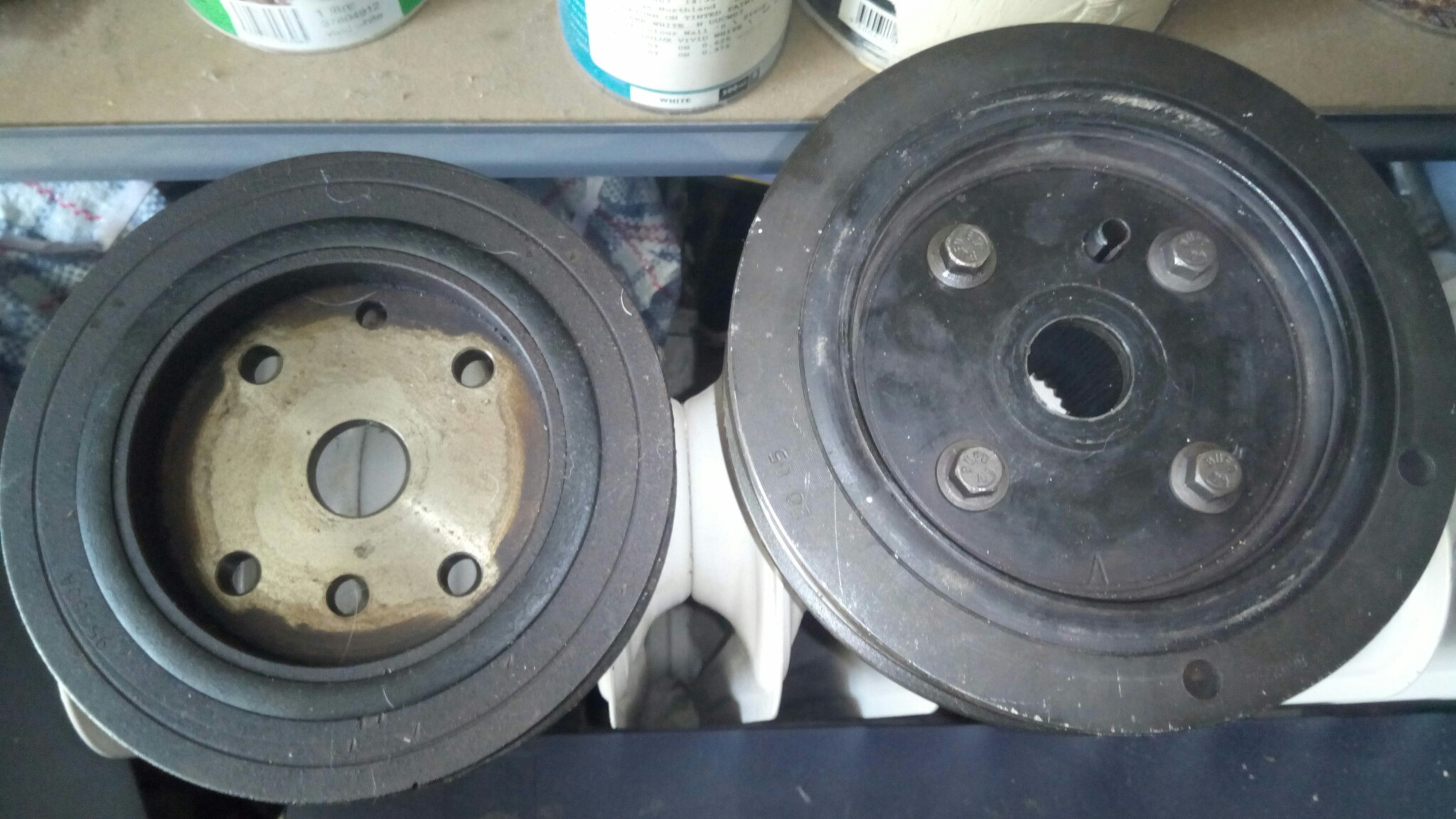 - Incidentally, one of the Crank Pulley bolts lines up with the bolt on the Engine Mount (assuming your Engine Mount is still good and not collapsed), as shown in the red rectangle at roughly 8 o'clock position.