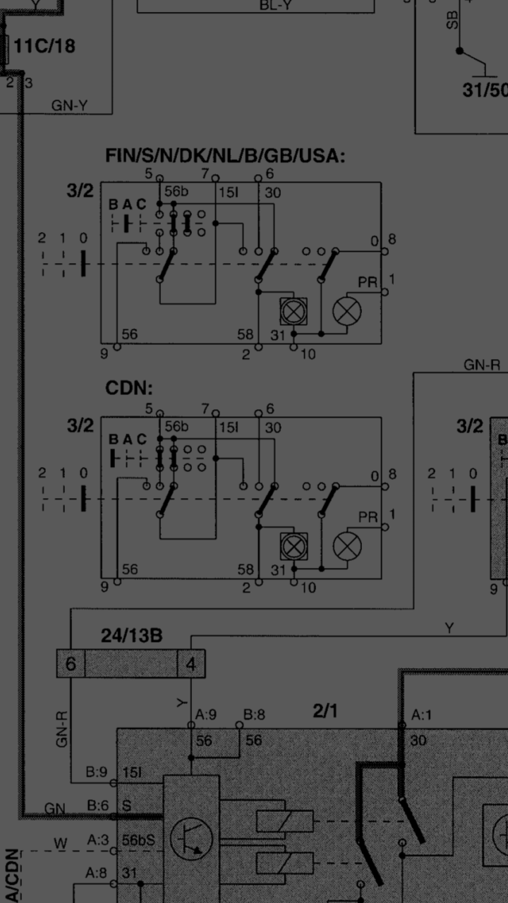 Please see the picture attached. It's a close up of the headlamp switch. I think that I can override the parking lights setting by having the remote relay bridging contact no. 30 and no. 58, right? I have the Dutch (NL) switch. Or am I overlooking something and will this end in tears?