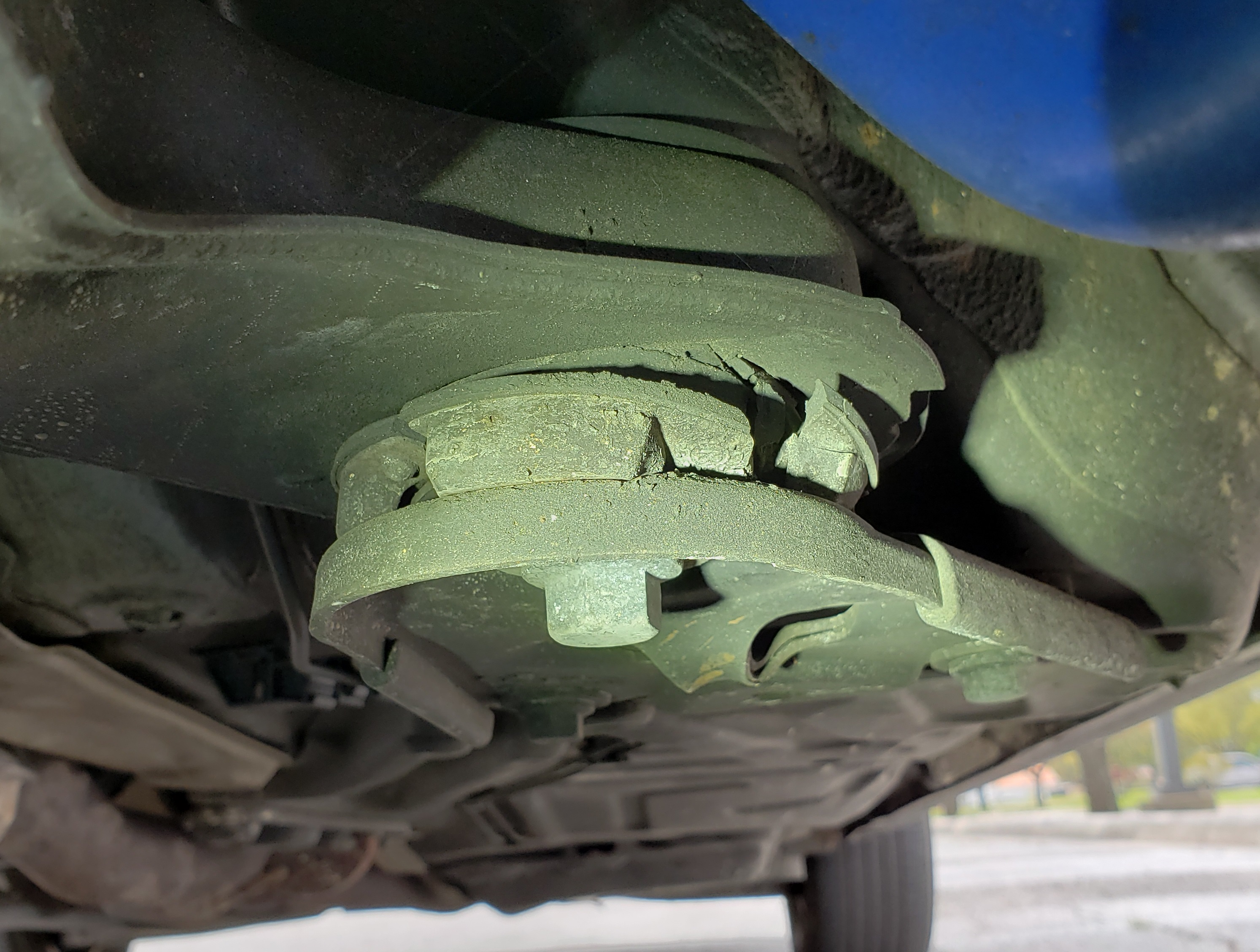 In this case, it looks like the one I have pictured is loose but also splitting. All 4 were replaced when they did the sway bar. Those bushings are the only replaceable parts attaching the subframe to the frame right? Either way, is it pretty safe to say that one is shot?