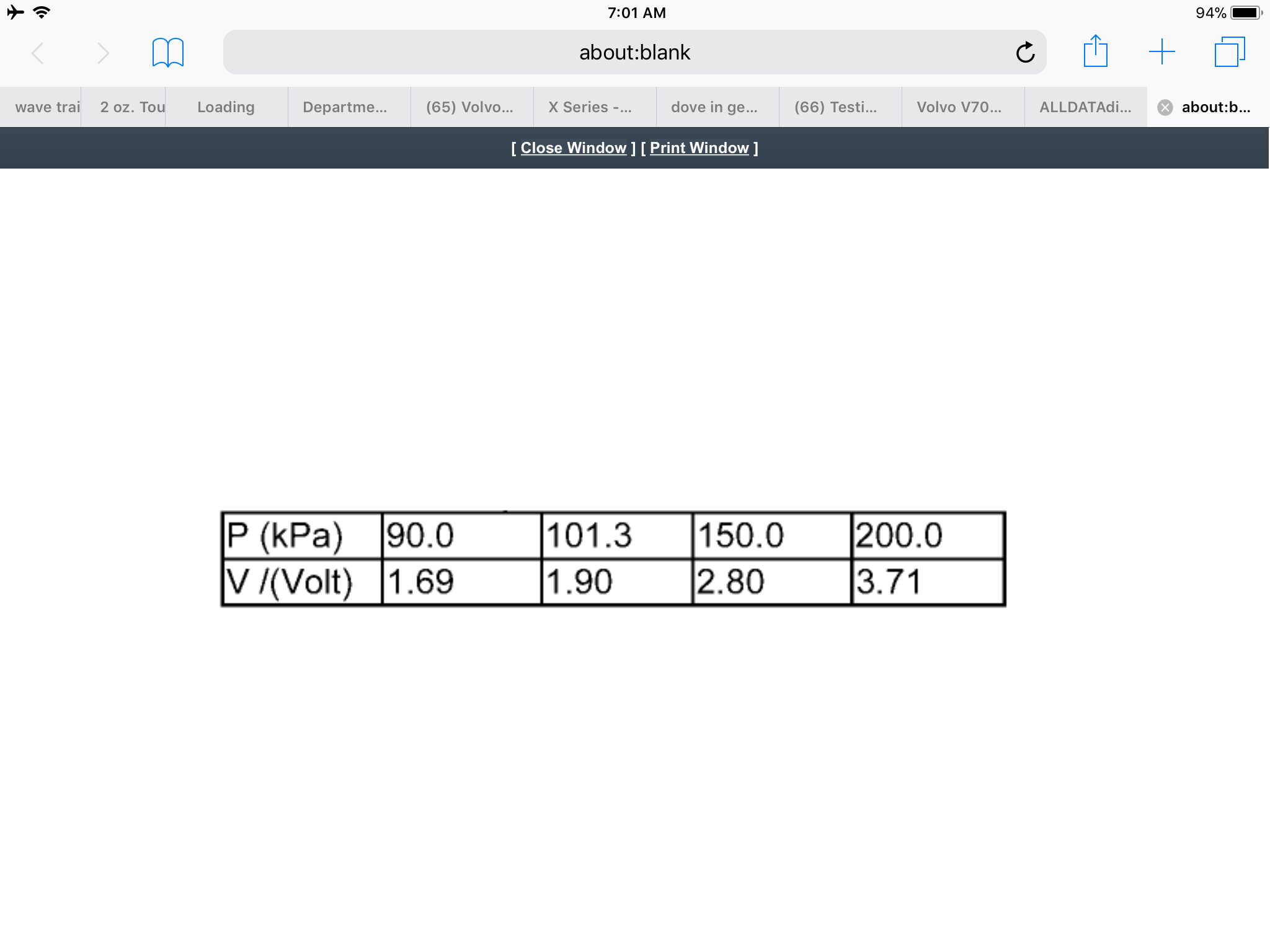 Hello, I have a 2007 Volvo S60 2.5T AWD sedan. I pulled codes P0238 & P0240, both related to the turbo boost sensor. Can I test the turbo boost sensor out of the car using an ohmmeter and if yes, what values should I expect to see from pin to pin?