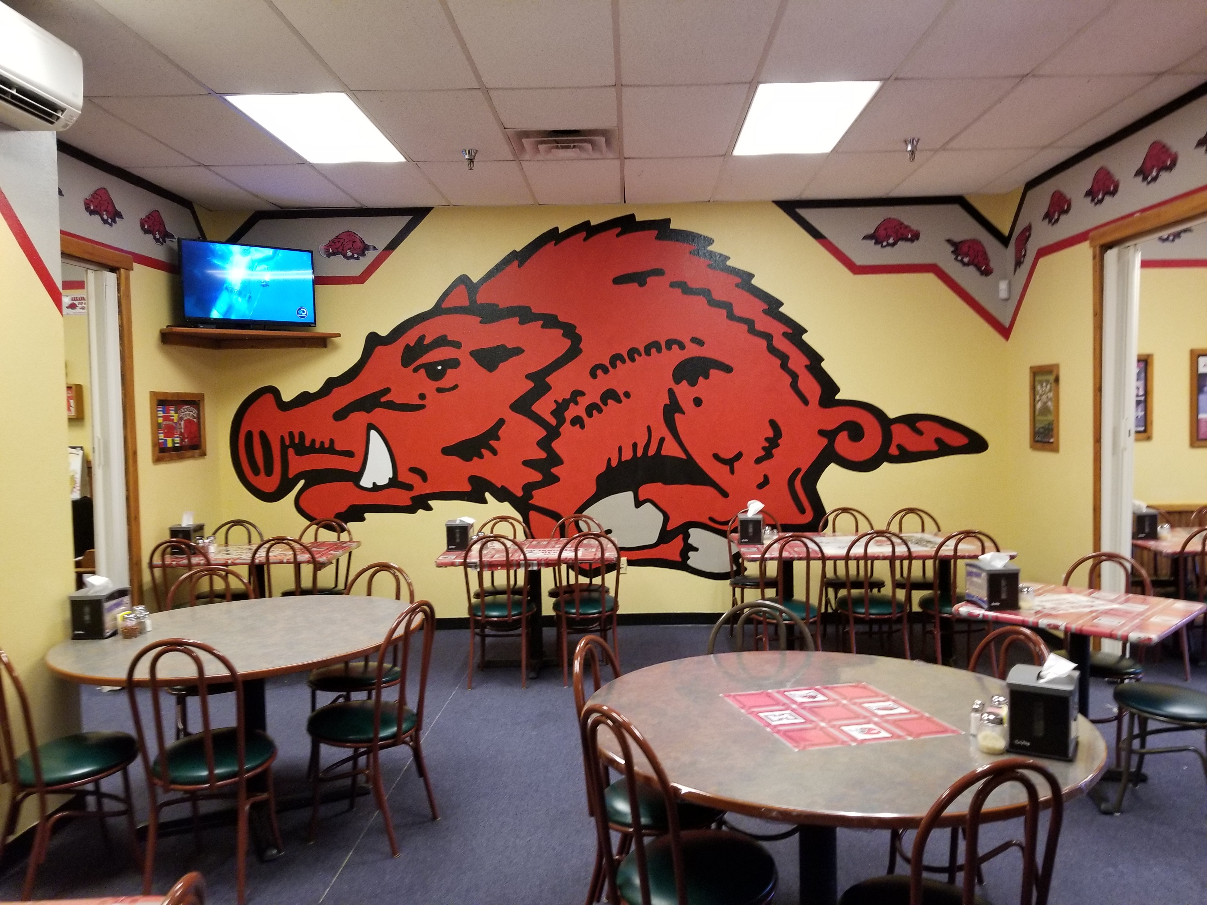 Found a cool pizza place here in Ft. Smith called Razorback Pizza. Seriously lots of pigs on the wall! The pizza was excellent. June