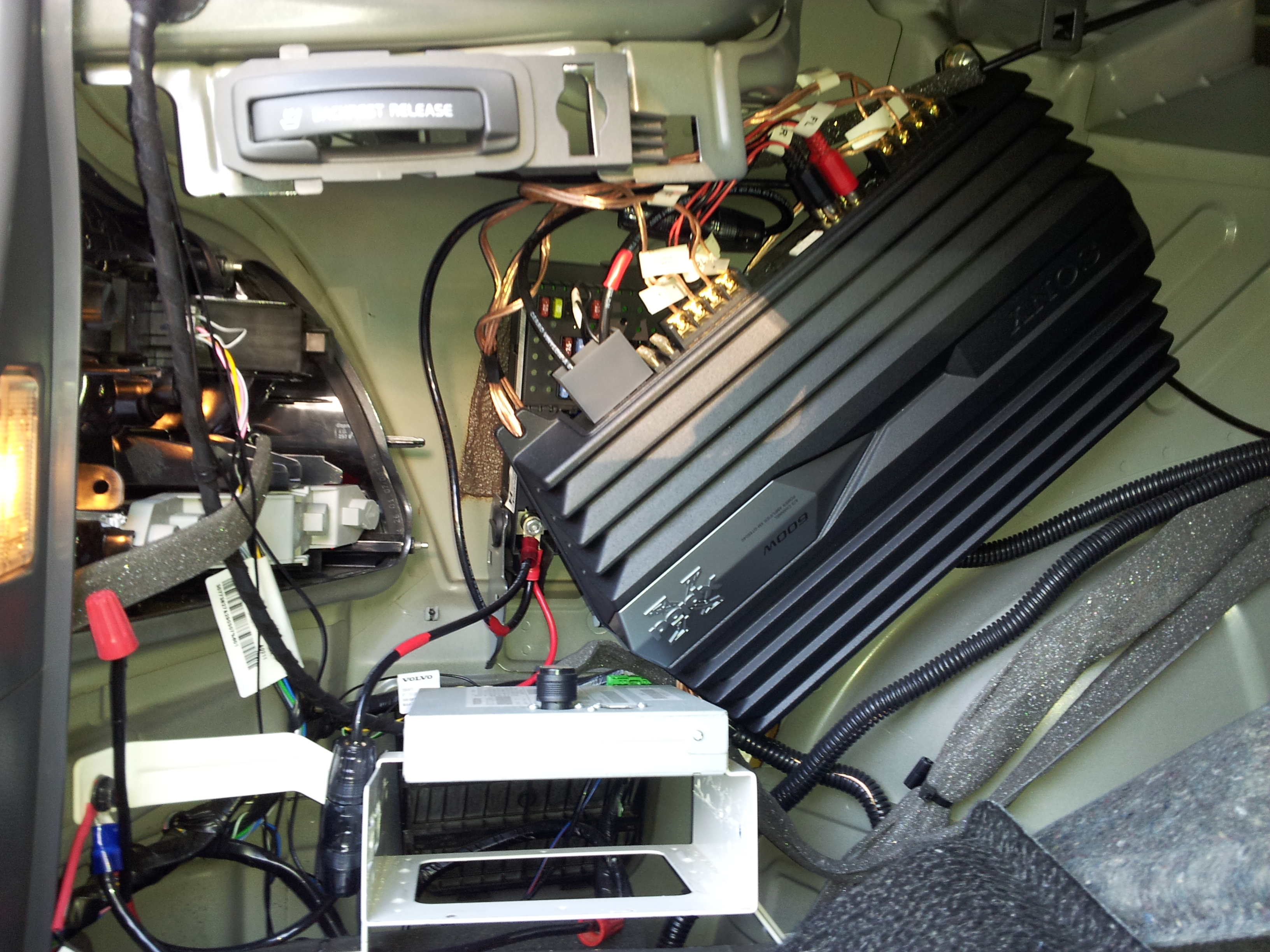 In this photo, you can see where the amp is mounted on the left wall of the trunk, behind the liners.