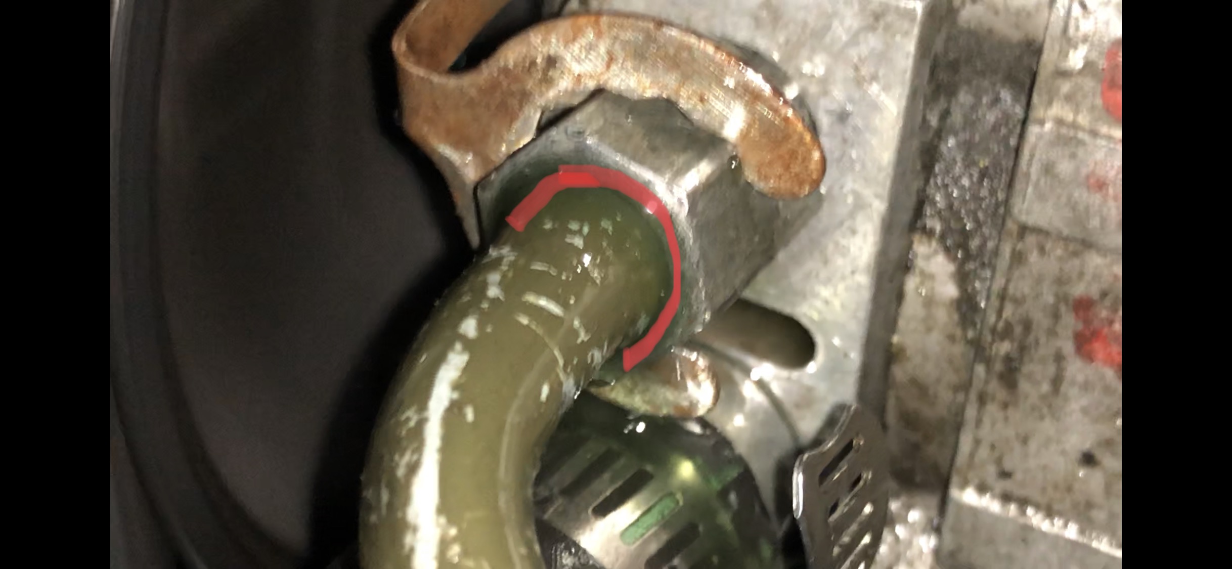 Over the past week or so, a leak has developed seeping from the power steering pressure line. Specifically, it’s coming from the joint between the pressure line itself and the nut that attaches it to the pump. At idle it produces a steady trickle of fluid, and when you actually try to drive the car and turn the wheels, it dumps nearly the entire contents of the reservoir. See attached photo, red line indicates leak area.
