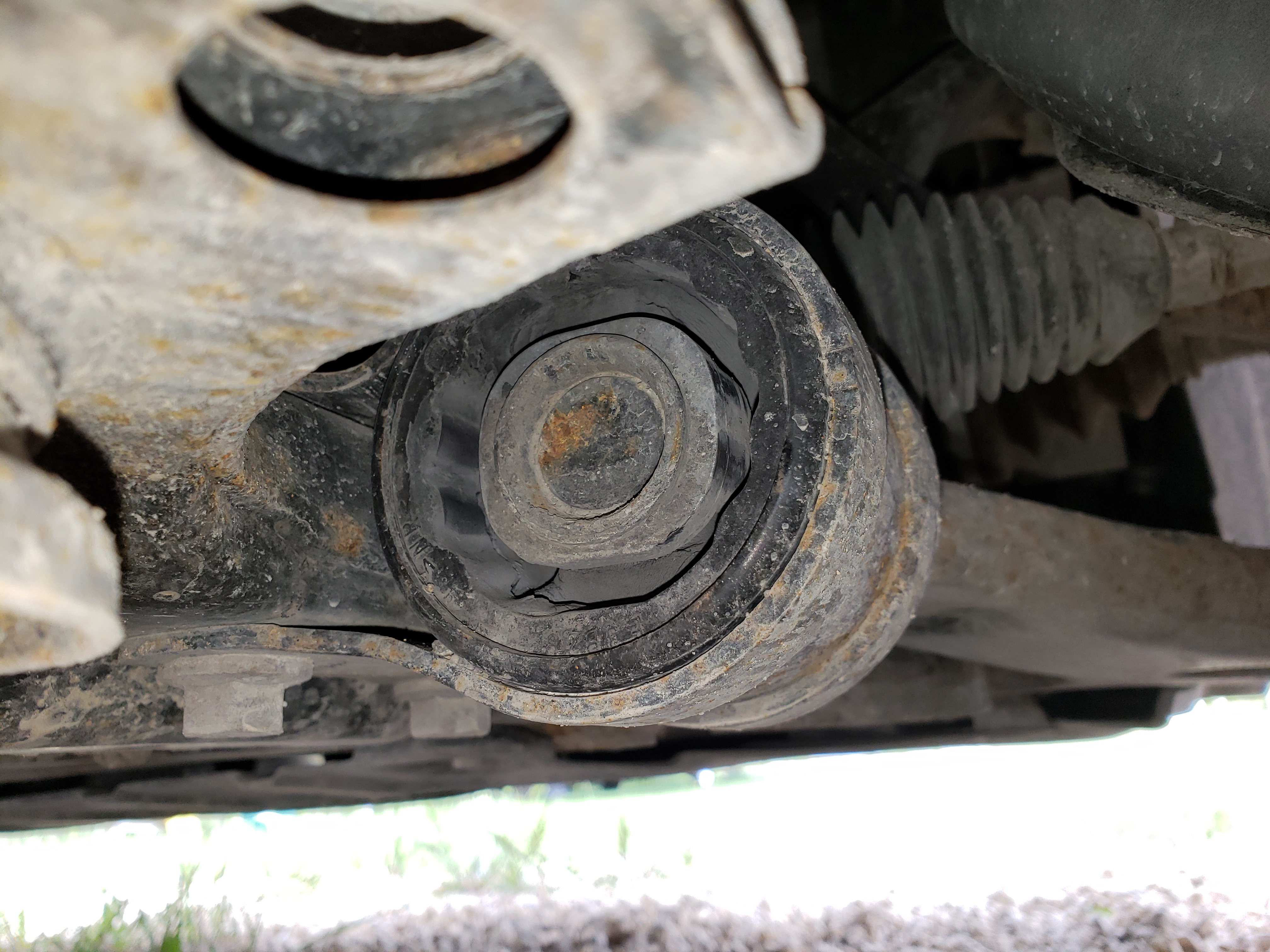 Pulled off the drivers side control arm and the rear bushing(one with 2 bolts) was just floating around in the mount. I could turn the mount by hand.