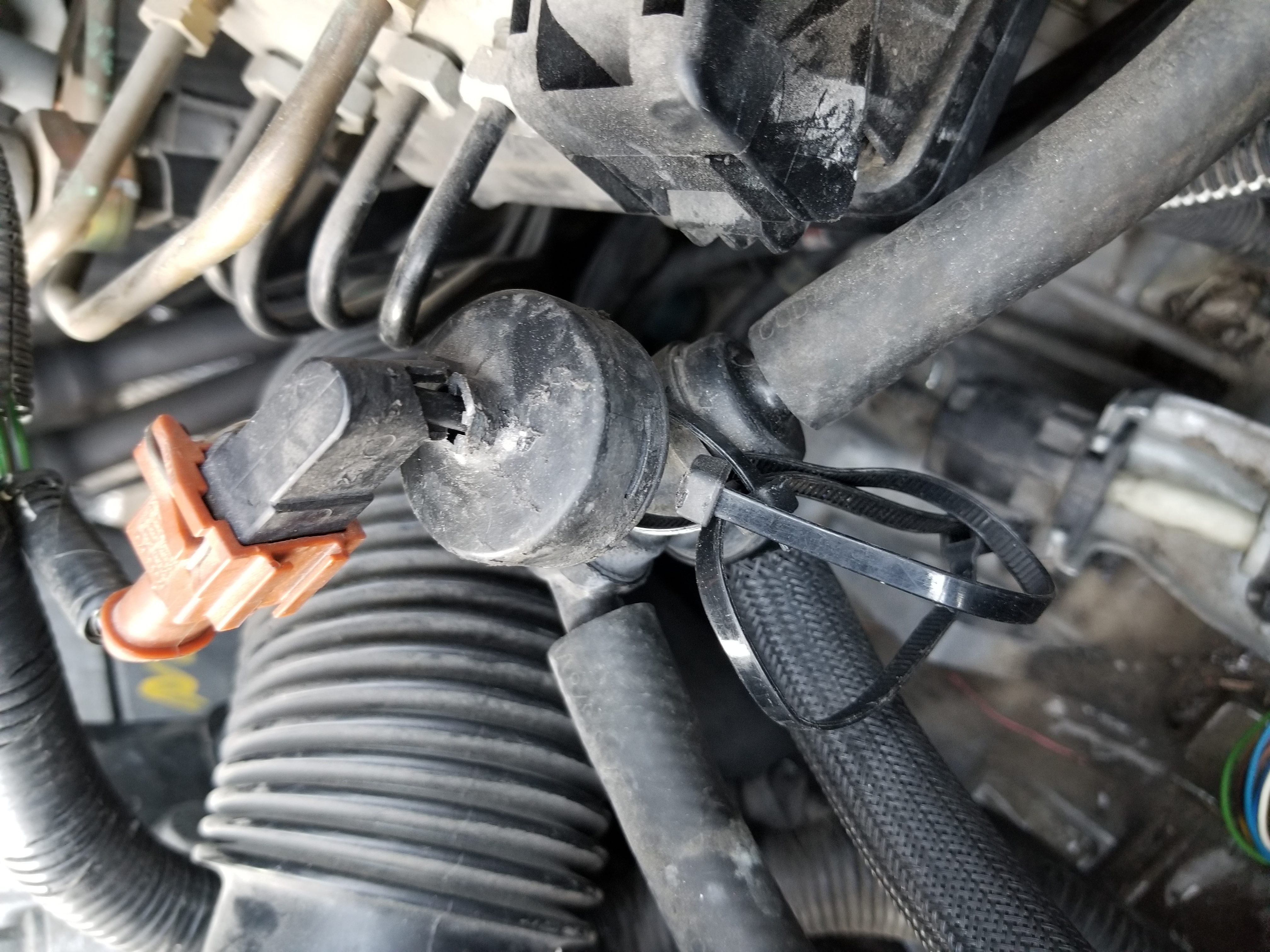 Fuel pressure sensor connector but the fuel rail does not have the provision for a FPS. That fuel rail has the fuel pressure test port where the open end should be for insertion/attachment of FPS. Is your check light on? There should be a STC for open sircuit to the fuel pressure sensor, probably two DTCs as the temperature of fuel signal is also missing. The retainer clip on the harness lead would have been popped into the black plastic cover that is not present in the pictures.